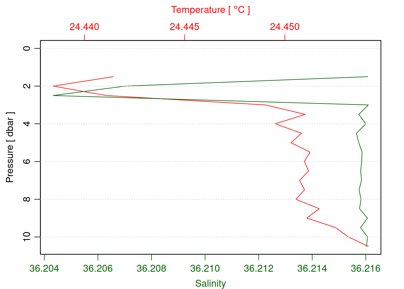 tryCatch({ oce::plotProfile(decimated_cast)# TODO: plot chl & do (prereq handle other_params in ctd_load_from_csv call above)}, error =function(e) {print("decimated cast not found")})