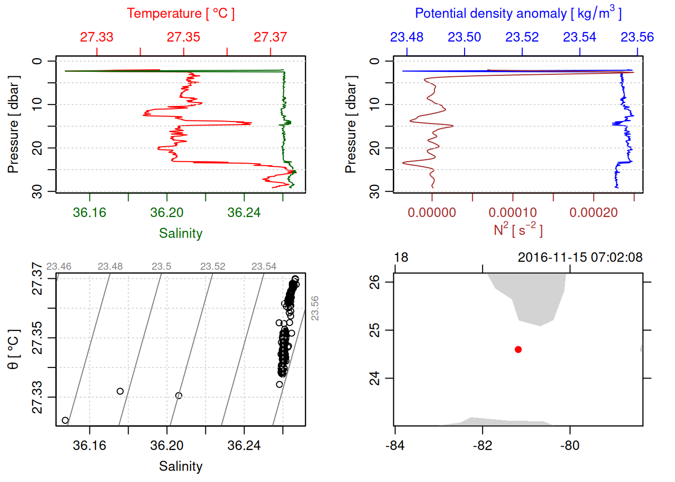 # TODO: Include param here that specifies to handle QC flags. This should be done before converting to a OCE object. QC flag columns are listed in [this spreadsheet](https://docs.google.com/spreadsheets/d/1uCxEmJRqErU-HCQiRQ1FpyiIqtNaGgMSBI0WvrtwBRU/edit?gid=137286311#gid=137286311) and are not supposed to be included in the oce object. QC param values are : # 1 good# 2 +/- 3*std_dev# 4 +/- 5*std_dev# 9 missing# Data column should be set to NA if corresponding QC column has value greater than threshold (recommended threshold is 5*std_dev).# Will need to loop through *_qc columns.# TODO: drop spikes (how? low-pass?).# TODO: combine replicate sensors (eg temp1 temp2).