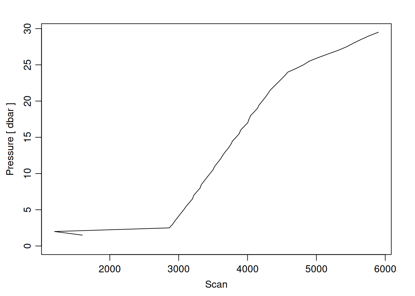 tryCatch({ trimmed_cast <-ctdTrim(cast) decimated_cast <-ctdDecimate(trimmed_cast, p =0.5)# plotting can cause the xlim failureplotScan(decimated_cast)# === export === cast_df <-as.data.frame(decimated_cast@data)# Add metadata cast_df <-mutate( cast_df,station = station_id,cruise_id = cruise_id )# drop NA rows left by cleaning cast_df <-subset(cast_df, !is.na(scan))# create folder if doesn't exist clean_data_loc <- here::here("data/02_clean")try(fs::dir_create(clean_data_loc))# save ctd to .csvwrite.csv(cast_df, glue("{clean_data_loc}/{params$cast_id}.csv"))}, error =function(e) {cat("\n=== CTD PROCESSING ERROR ===\n")cat("Cast ID:", params$cast_id, "\n")cat("Error message:\n", conditionMessage(e), "\n\n")# Safely inspect objects that might or might not exist when the error happenedif (exists("decimated_cast")) { df <-try(as.data.frame(decimated_cast@data), silent =TRUE)if (!inherits(df, "try-error")) {cat("Dataframe columns:\n")print(names(df))cat("\nSummary of key columns (scan, pressure, temperature, salinity if present):\n") known_cols <-intersect(c("scan", "pressure", "temp", "temperature", "salinity", "conductivity"), names(df))print(summary(df[known_cols], digits =3))cat("\nHead of dataframe:\n")print(head(df)) } else {cat("Could not extract dataframe from decimated_cast.\n") } } else {cat("decimated_cast was never created before the error.\n") }cat("\n=== END ERROR DEBUG INFO ===\n\n")})