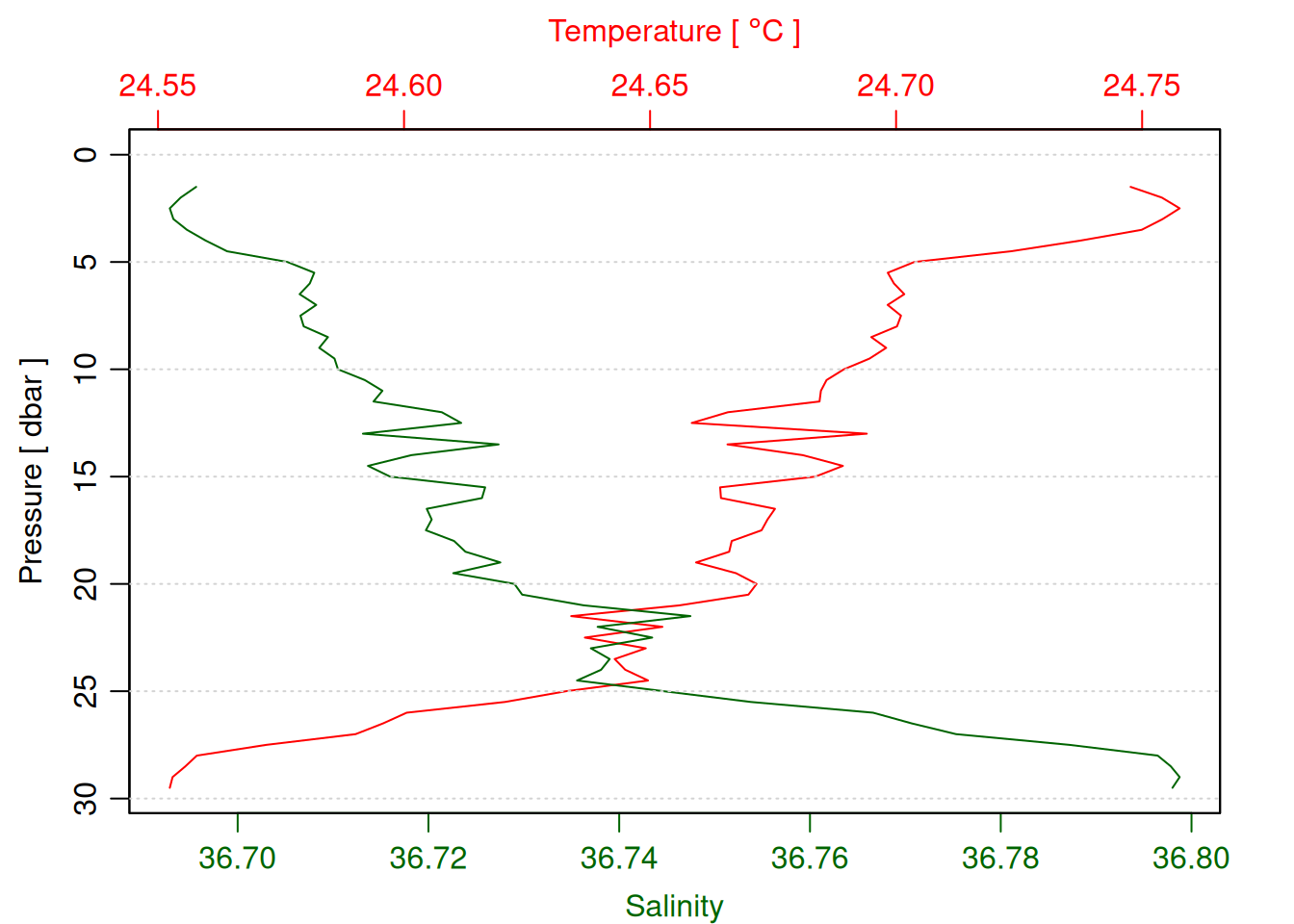 tryCatch({ oce::plotProfile(decimated_cast)# TODO: plot chl & do (prereq handle other_params in ctd_load_from_csv call above)}, error =function(e) {print("decimated cast not found")})