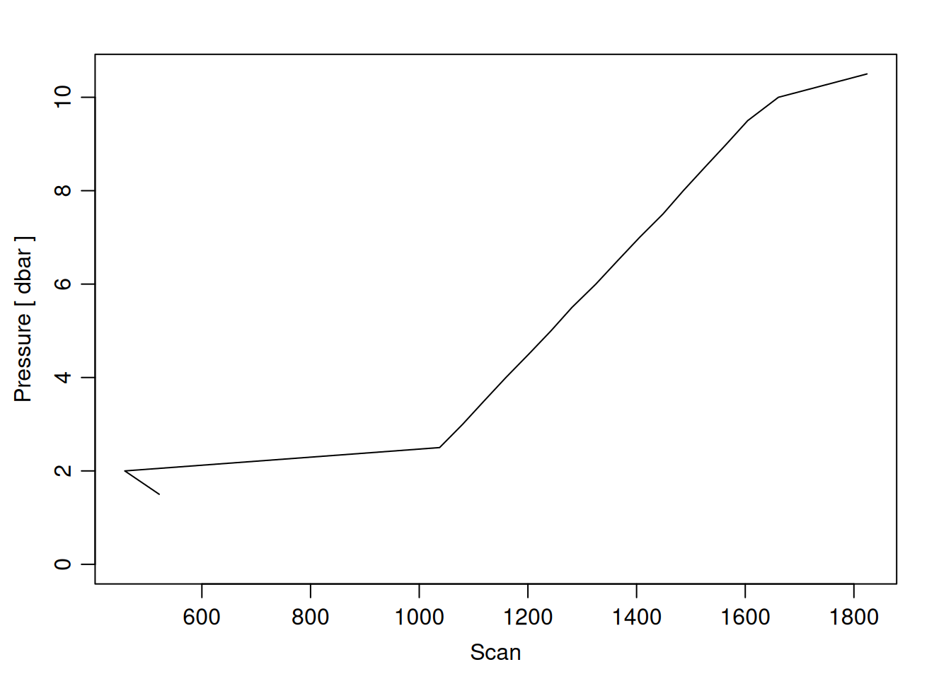 tryCatch({ trimmed_cast <-ctdTrim(cast) decimated_cast <-ctdDecimate(trimmed_cast, p =0.5)# plotting can cause the xlim failureplotScan(decimated_cast)# === export === cast_df <-as.data.frame(decimated_cast@data)# Add metadata cast_df <-mutate( cast_df,station = station_id,cruise_id = cruise_id )# drop NA rows left by cleaning cast_df <-subset(cast_df, !is.na(scan))# create folder if doesn't exist clean_data_loc <- here::here("data/02_clean")try(fs::dir_create(clean_data_loc))# save ctd to .csvwrite.csv(cast_df, glue("{clean_data_loc}/{params$cast_id}.csv"))}, error =function(e) {cat("\n=== CTD PROCESSING ERROR ===\n")cat("Cast ID:", params$cast_id, "\n")cat("Error message:\n", conditionMessage(e), "\n\n")# Safely inspect objects that might or might not exist when the error happenedif (exists("decimated_cast")) { df <-try(as.data.frame(decimated_cast@data), silent =TRUE)if (!inherits(df, "try-error")) {cat("Dataframe columns:\n")print(names(df))cat("\nSummary of key columns (scan, pressure, temperature, salinity if present):\n") known_cols <-intersect(c("scan", "pressure", "temp", "temperature", "salinity", "conductivity"), names(df))print(summary(df[known_cols], digits =3))cat("\nHead of dataframe:\n")print(head(df)) } else {cat("Could not extract dataframe from decimated_cast.\n") } } else {cat("decimated_cast was never created before the error.\n") }cat("\n=== END ERROR DEBUG INFO ===\n\n")})