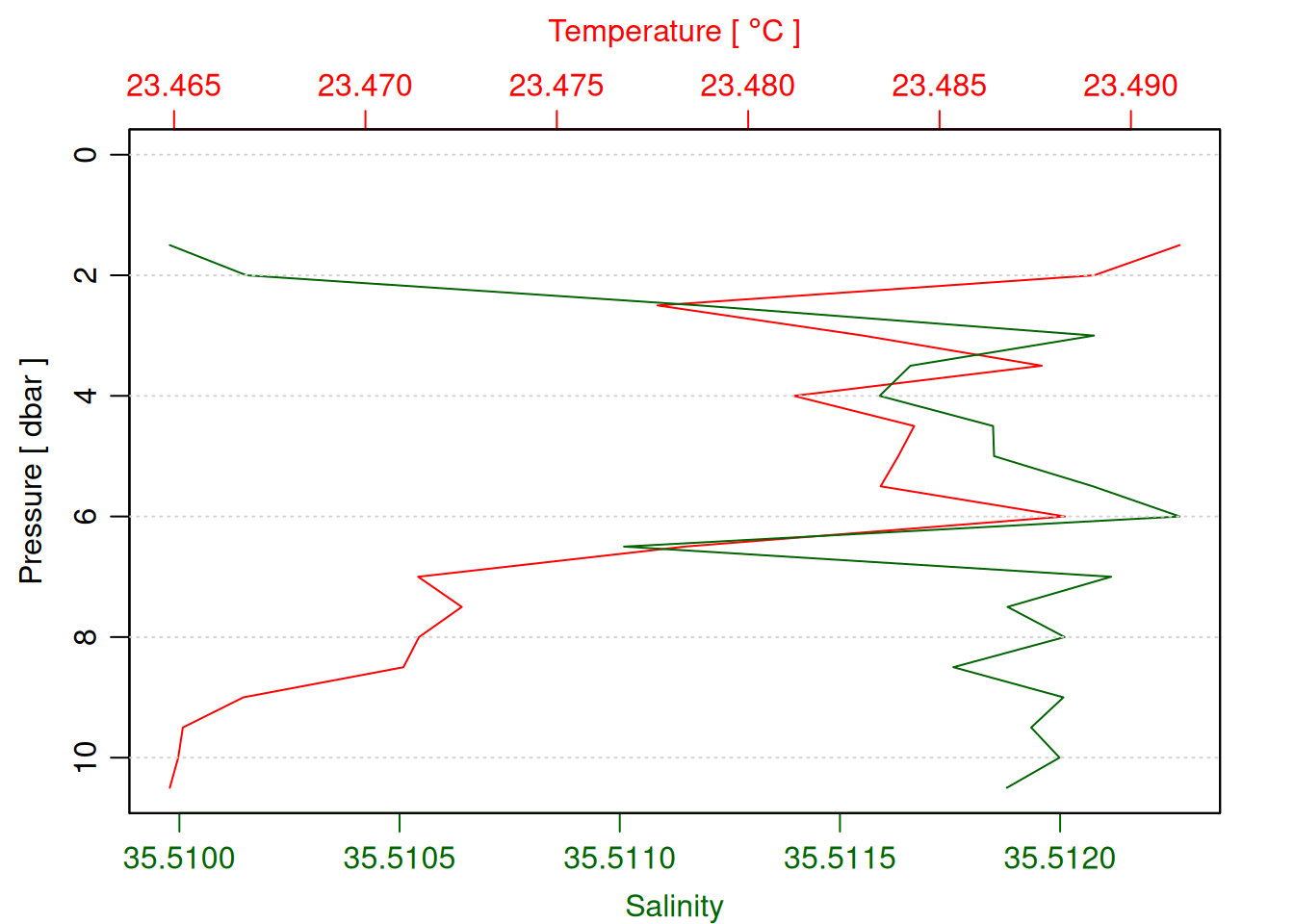 tryCatch({ oce::plotProfile(decimated_cast)# TODO: plot chl & do (prereq handle other_params in ctd_load_from_csv call above)}, error =function(e) {print("decimated cast not found")})