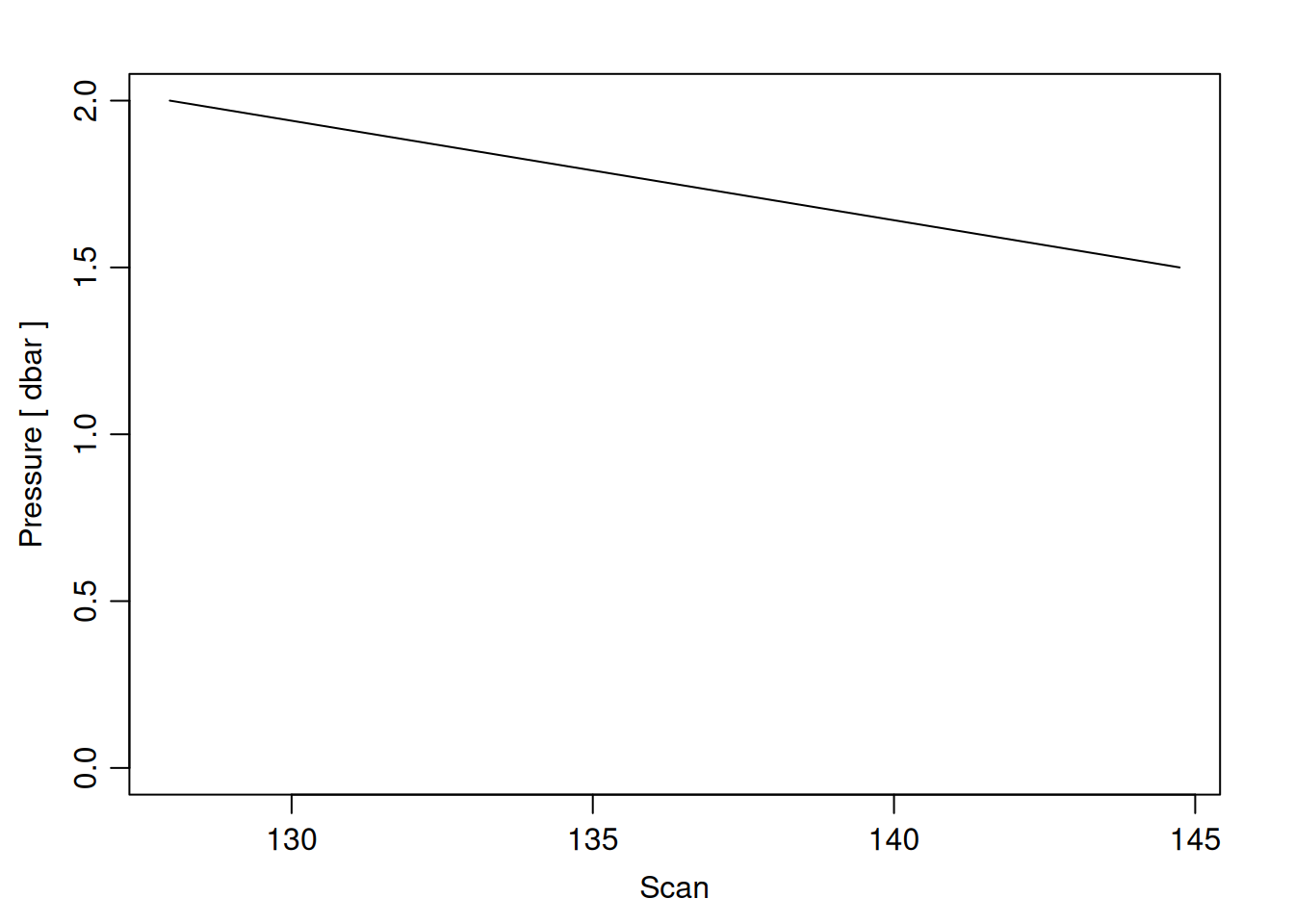 tryCatch({ trimmed_cast <-ctdTrim(cast) decimated_cast <-ctdDecimate(trimmed_cast, p =0.5)# plotting can cause the xlim failureplotScan(decimated_cast)# === export === cast_df <-as.data.frame(decimated_cast@data)# Add metadata cast_df <-mutate( cast_df,station = station_id,cruise_id = cruise_id )# drop NA rows left by cleaning cast_df <-subset(cast_df, !is.na(scan))# create folder if doesn't exist clean_data_loc <- here::here("data/02_clean")try(fs::dir_create(clean_data_loc))# save ctd to .csvwrite.csv(cast_df, glue("{clean_data_loc}/{params$cast_id}.csv"))}, error =function(e) {cat("\n=== CTD PROCESSING ERROR ===\n")cat("Cast ID:", params$cast_id, "\n")cat("Error message:\n", conditionMessage(e), "\n\n")# Safely inspect objects that might or might not exist when the error happenedif (exists("decimated_cast")) { df <-try(as.data.frame(decimated_cast@data), silent =TRUE)if (!inherits(df, "try-error")) {cat("Dataframe columns:\n")print(names(df))cat("\nSummary of key columns (scan, pressure, temperature, salinity if present):\n") known_cols <-intersect(c("scan", "pressure", "temp", "temperature", "salinity", "conductivity"), names(df))print(summary(df[known_cols], digits =3))cat("\nHead of dataframe:\n")print(head(df)) } else {cat("Could not extract dataframe from decimated_cast.\n") } } else {cat("decimated_cast was never created before the error.\n") }cat("\n=== END ERROR DEBUG INFO ===\n\n")})