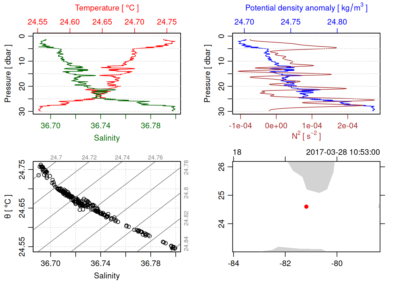 # TODO: Include param here that specifies to handle QC flags. This should be done before converting to a OCE object. QC flag columns are listed in [this spreadsheet](https://docs.google.com/spreadsheets/d/1uCxEmJRqErU-HCQiRQ1FpyiIqtNaGgMSBI0WvrtwBRU/edit?gid=137286311#gid=137286311) and are not supposed to be included in the oce object. QC param values are : # 1 good# 2 +/- 3*std_dev# 4 +/- 5*std_dev# 9 missing# Data column should be set to NA if corresponding QC column has value greater than threshold (recommended threshold is 5*std_dev).# Will need to loop through *_qc columns.# TODO: drop spikes (how? low-pass?).# TODO: combine replicate sensors (eg temp1 temp2).