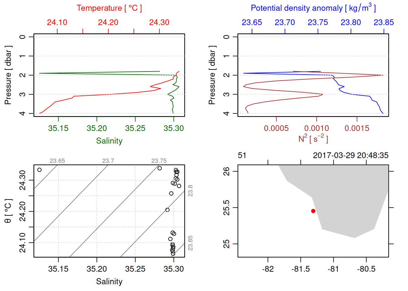 tryCatch({ trimmed_cast <-ctdTrim(cast) decimated_cast <-ctdDecimate(trimmed_cast, p =0.1)# plotting can cause the xlim failureplot(decimated_cast)# === export ===# Get the scan numbers that remain after cleaning cleaned_scans <- decimated_cast@data$scan# Load original raw data to keep all columns ctd_raw <- readr::read_csv(dataFile, show_col_types =FALSE)# Filter raw data to only include the cleaned scans cast_df <- ctd_raw %>%filter(!is.na(sea_water_pressure)) %>%# Remove rows without pressure datamutate(row_num =row_number()) %>%filter(row_num %in% cleaned_scans) %>%select(-row_num)# Add metadata cast_df <-mutate( cast_df,station = station_id,cruise_id = cruise_id )# Check if there are any rows in the cleaned dataif (nrow(cast_df) ==0) {cat("\n=== WARNING: NO DATA AFTER CLEANING ===\n")cat("Cast ID:", params$cast_id, "\n")cat("Station:", station_id, "\n")cat("Cruise:", cruise_id, "\n\n")cat("Raw data rows (with pressure):", sum(!is.na(ctd_raw$sea_water_pressure)), "\n")cat("Cleaned scans to keep:", length(cleaned_scans), "\n")cat("Resulting rows:", nrow(cast_df), "\n\n")cat("Raw data summary:\n")print(summary(ctd_raw[c("sea_water_pressure", "sea_water_temperature", "sea_water_salinity")]))cat("\nCleaned scans (first 20):\n")print(head(cleaned_scans, 20))cat("\n=== CSV FILE NOT CREATED (no data) ===\n\n") } else {# create folder if doesn't exist clean_data_loc <- here::here("data/02_clean")try(fs::dir_create(clean_data_loc))# save ctd to .csv (without row names/indices)write.csv(cast_df, glue("{clean_data_loc}/{params$cast_id}.csv"), row.names =FALSE)cat("Successfully saved", nrow(cast_df), "rows to", glue("{params$cast_id}.csv"), "\n") }}, error =function(e) {cat("\n=== CTD PROCESSING ERROR ===\n")cat("Cast ID:", params$cast_id, "\n")cat("Error message:\n", conditionMessage(e), "\n\n")# Safely inspect objects that might or might not exist when the error happenedif (exists("decimated_cast")) { df <-try(as.data.frame(decimated_cast@data), silent =TRUE)if (!inherits(df, "try-error")) {cat("Dataframe columns:\n")print(names(df))cat("\nSummary of key columns (scan, pressure, temperature, salinity if present):\n") known_cols <-intersect(c("scan", "pressure", "temp", "temperature", "salinity", "conductivity"), names(df))print(summary(df[known_cols], digits =3))cat("\nHead of dataframe:\n")print(head(df)) } else {cat("Could not extract dataframe from decimated_cast.\n") } } else {cat("decimated_cast was never created before the error.\n") }cat("\n=== END ERROR DEBUG INFO ===\n\n")})