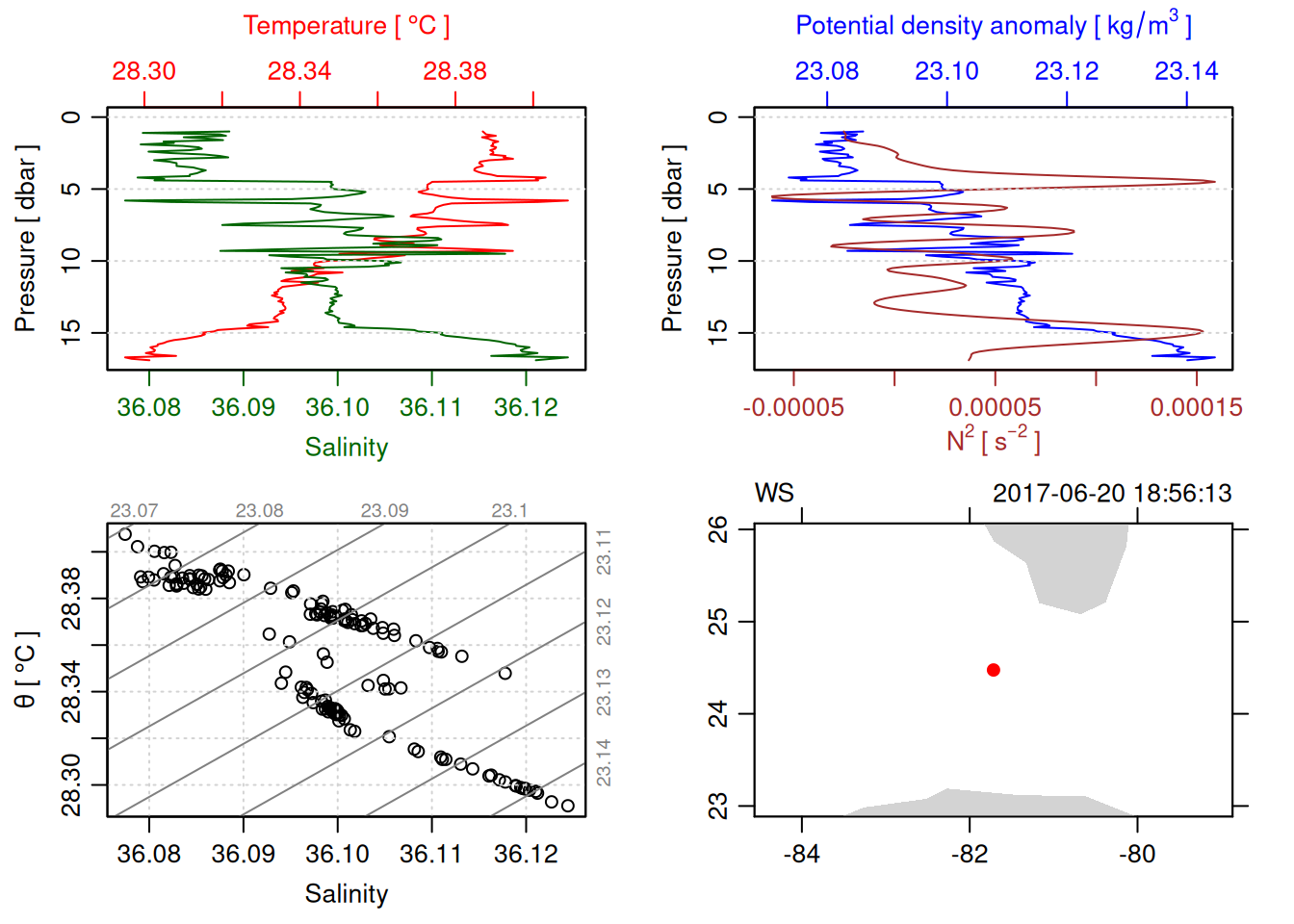 tryCatch({ trimmed_cast <-ctdTrim(cast) decimated_cast <-ctdDecimate(trimmed_cast, p =0.1)# plotting can cause the xlim failureplot(decimated_cast)# === export ===# Get the scan numbers that remain after cleaning cleaned_scans <- decimated_cast@data$scan# Load original raw data to keep all columns ctd_raw <- readr::read_csv(dataFile, show_col_types =FALSE)# Filter raw data to only include the cleaned scans cast_df <- ctd_raw %>%filter(!is.na(sea_water_pressure)) %>%# Remove rows without pressure datamutate(row_num =row_number()) %>%filter(row_num %in% cleaned_scans) %>%select(-row_num)# Add metadata cast_df <-mutate( cast_df,station = station_id,cruise_id = cruise_id )# Check if there are any rows in the cleaned dataif (nrow(cast_df) ==0) {cat("\n=== WARNING: NO DATA AFTER CLEANING ===\n")cat("Cast ID:", params$cast_id, "\n")cat("Station:", station_id, "\n")cat("Cruise:", cruise_id, "\n\n")cat("Raw data rows (with pressure):", sum(!is.na(ctd_raw$sea_water_pressure)), "\n")cat("Cleaned scans to keep:", length(cleaned_scans), "\n")cat("Resulting rows:", nrow(cast_df), "\n\n")cat("Raw data summary:\n")print(summary(ctd_raw[c("sea_water_pressure", "sea_water_temperature", "sea_water_salinity")]))cat("\nCleaned scans (first 20):\n")print(head(cleaned_scans, 20))cat("\n=== CSV FILE NOT CREATED (no data) ===\n\n") } else {# create folder if doesn't exist clean_data_loc <- here::here("data/02_clean")try(fs::dir_create(clean_data_loc))# save ctd to .csv (without row names/indices)write.csv(cast_df, glue("{clean_data_loc}/{params$cast_id}.csv"), row.names =FALSE)cat("Successfully saved", nrow(cast_df), "rows to", glue("{params$cast_id}.csv"), "\n") }}, error =function(e) {cat("\n=== CTD PROCESSING ERROR ===\n")cat("Cast ID:", params$cast_id, "\n")cat("Error message:\n", conditionMessage(e), "\n\n")# Safely inspect objects that might or might not exist when the error happenedif (exists("decimated_cast")) { df <-try(as.data.frame(decimated_cast@data), silent =TRUE)if (!inherits(df, "try-error")) {cat("Dataframe columns:\n")print(names(df))cat("\nSummary of key columns (scan, pressure, temperature, salinity if present):\n") known_cols <-intersect(c("scan", "pressure", "temp", "temperature", "salinity", "conductivity"), names(df))print(summary(df[known_cols], digits =3))cat("\nHead of dataframe:\n")print(head(df)) } else {cat("Could not extract dataframe from decimated_cast.\n") } } else {cat("decimated_cast was never created before the error.\n") }cat("\n=== END ERROR DEBUG INFO ===\n\n")})