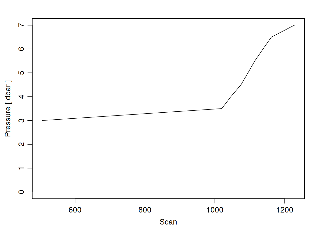 tryCatch({ trimmed_cast <-ctdTrim(cast) decimated_cast <-ctdDecimate(trimmed_cast, p =0.5)# plotting can cause the xlim failureplotScan(decimated_cast)# === export === cast_df <-as.data.frame(decimated_cast@data)# Add metadata cast_df <-mutate( cast_df,station = station_id,cruise_id = cruise_id )# drop NA rows left by cleaning cast_df <-subset(cast_df, !is.na(scan))# create folder if doesn't exist clean_data_loc <- here::here("data/02_clean")try(fs::dir_create(clean_data_loc))# save ctd to .csvwrite.csv(cast_df, glue("{clean_data_loc}/{params$cast_id}.csv"))}, error =function(e) {cat("\n=== CTD PROCESSING ERROR ===\n")cat("Cast ID:", params$cast_id, "\n")cat("Error message:\n", conditionMessage(e), "\n\n")# Safely inspect objects that might or might not exist when the error happenedif (exists("decimated_cast")) { df <-try(as.data.frame(decimated_cast@data), silent =TRUE)if (!inherits(df, "try-error")) {cat("Dataframe columns:\n")print(names(df))cat("\nSummary of key columns (scan, pressure, temperature, salinity if present):\n") known_cols <-intersect(c("scan", "pressure", "temp", "temperature", "salinity", "conductivity"), names(df))print(summary(df[known_cols], digits =3))cat("\nHead of dataframe:\n")print(head(df)) } else {cat("Could not extract dataframe from decimated_cast.\n") } } else {cat("decimated_cast was never created before the error.\n") }cat("\n=== END ERROR DEBUG INFO ===\n\n")})
