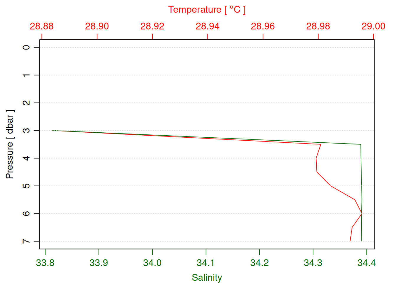 tryCatch({ oce::plotProfile(decimated_cast)# TODO: plot chl & do (prereq handle other_params in ctd_load_from_csv call above)}, error =function(e) {print("decimated cast not found")})