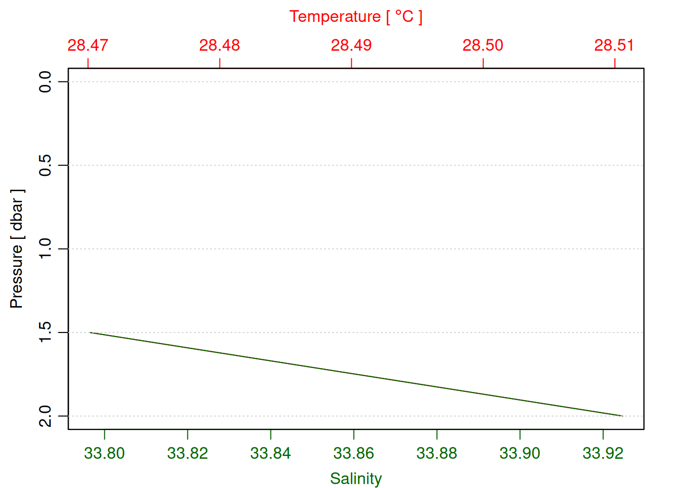 tryCatch({ oce::plotProfile(decimated_cast)# TODO: plot chl & do (prereq handle other_params in ctd_load_from_csv call above)}, error =function(e) {print("decimated cast not found")})