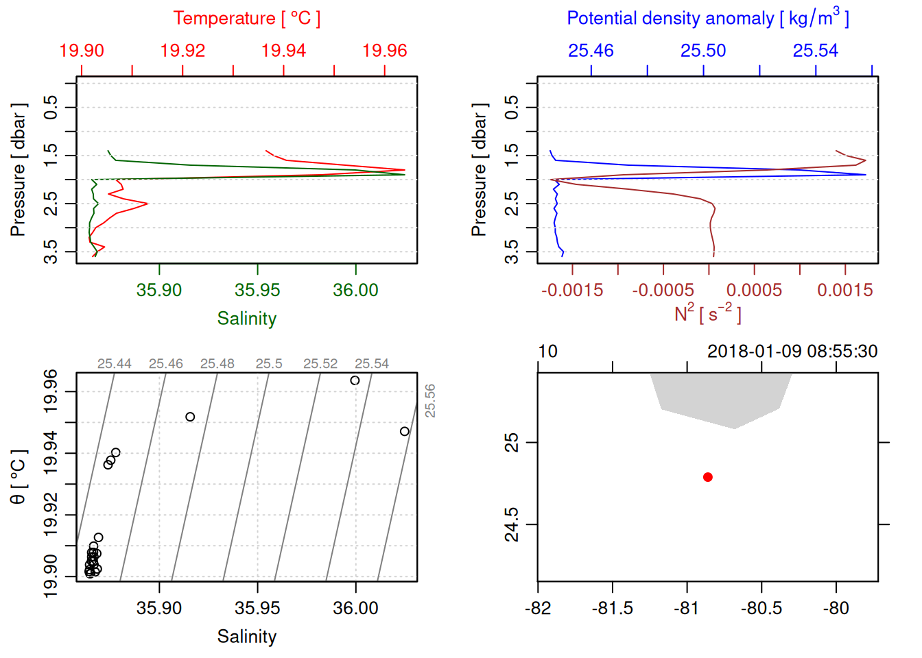 # TODO: Include param here that specifies to handle QC flags. This should be done before converting to a OCE object. QC flag columns are listed in [this spreadsheet](https://docs.google.com/spreadsheets/d/1uCxEmJRqErU-HCQiRQ1FpyiIqtNaGgMSBI0WvrtwBRU/edit?gid=137286311#gid=137286311) and are not supposed to be included in the oce object. QC param values are : # 1 good# 2 +/- 3*std_dev# 4 +/- 5*std_dev# 9 missing# Data column should be set to NA if corresponding QC column has value greater than threshold (recommended threshold is 5*std_dev).# Will need to loop through *_qc columns.# TODO: drop spikes (how? low-pass?).# TODO: combine replicate sensors (eg temp1 temp2).