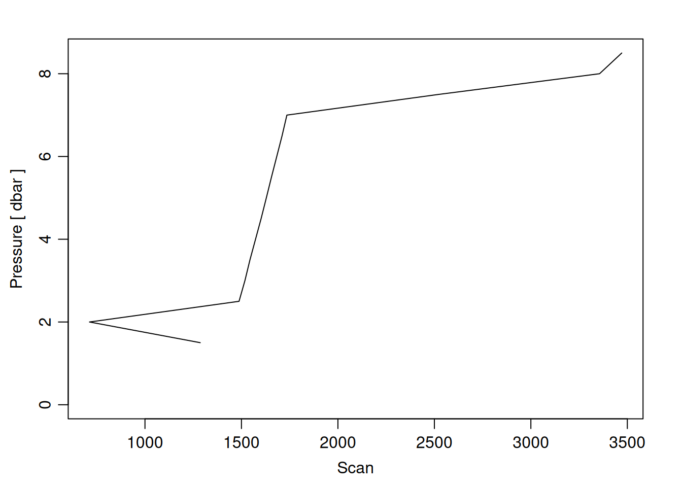 tryCatch({ trimmed_cast <-ctdTrim(cast) decimated_cast <-ctdDecimate(trimmed_cast, p =0.5)# plotting can cause the xlim failureplotScan(decimated_cast)# === export === cast_df <-as.data.frame(decimated_cast@data)# Add metadata cast_df <-mutate( cast_df,station = station_id,cruise_id = cruise_id )# drop NA rows left by cleaning cast_df <-subset(cast_df, !is.na(scan))# create folder if doesn't exist clean_data_loc <- here::here("data/02_clean")try(fs::dir_create(clean_data_loc))# save ctd to .csvwrite.csv(cast_df, glue("{clean_data_loc}/{params$cast_id}.csv"))}, error =function(e) {cat("\n=== CTD PROCESSING ERROR ===\n")cat("Cast ID:", params$cast_id, "\n")cat("Error message:\n", conditionMessage(e), "\n\n")# Safely inspect objects that might or might not exist when the error happenedif (exists("decimated_cast")) { df <-try(as.data.frame(decimated_cast@data), silent =TRUE)if (!inherits(df, "try-error")) {cat("Dataframe columns:\n")print(names(df))cat("\nSummary of key columns (scan, pressure, temperature, salinity if present):\n") known_cols <-intersect(c("scan", "pressure", "temp", "temperature", "salinity", "conductivity"), names(df))print(summary(df[known_cols], digits =3))cat("\nHead of dataframe:\n")print(head(df)) } else {cat("Could not extract dataframe from decimated_cast.\n") } } else {cat("decimated_cast was never created before the error.\n") }cat("\n=== END ERROR DEBUG INFO ===\n\n")})