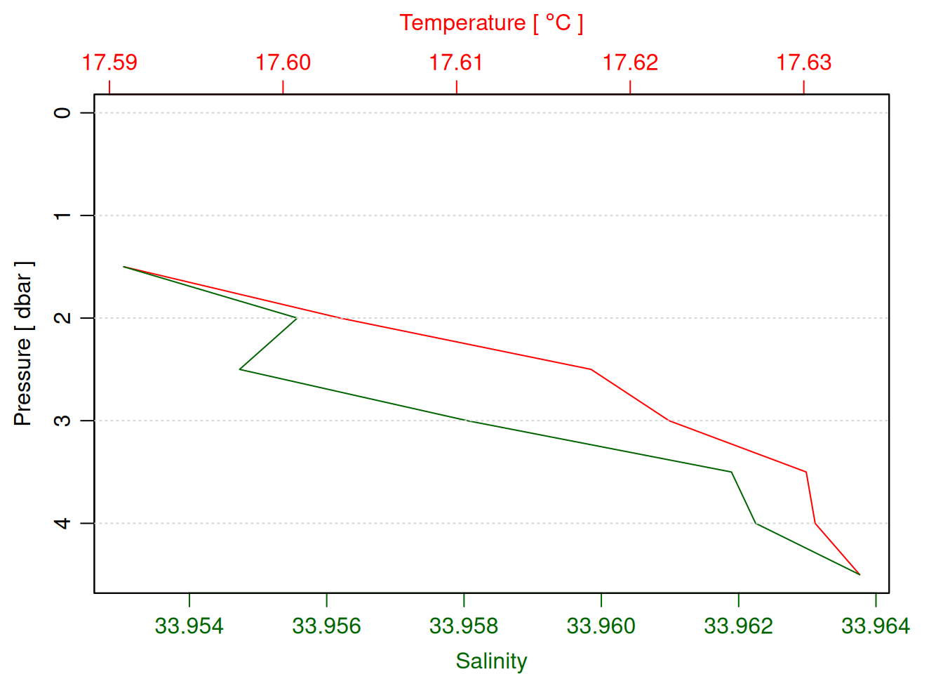 tryCatch({ oce::plotProfile(decimated_cast)# TODO: plot chl & do (prereq handle other_params in ctd_load_from_csv call above)}, error =function(e) {print("decimated cast not found")})
