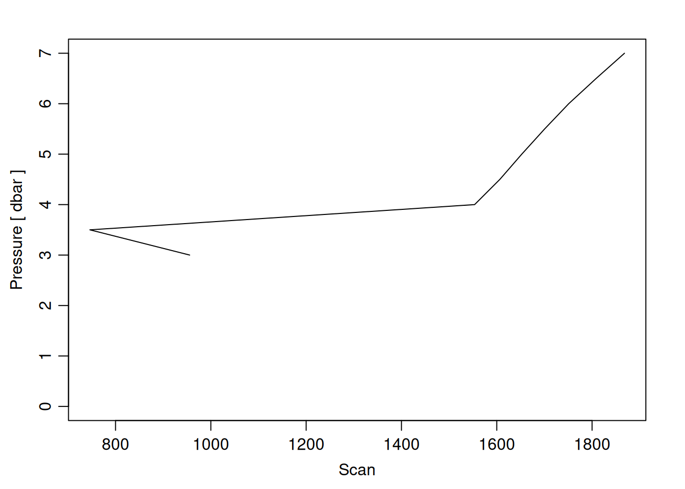 tryCatch({ trimmed_cast <-ctdTrim(cast) decimated_cast <-ctdDecimate(trimmed_cast, p =0.5)# plotting can cause the xlim failureplotScan(decimated_cast)# === export === cast_df <-as.data.frame(decimated_cast@data)# Add metadata cast_df <-mutate( cast_df,station = station_id,cruise_id = cruise_id )# drop NA rows left by cleaning cast_df <-subset(cast_df, !is.na(scan))# create folder if doesn't exist clean_data_loc <- here::here("data/02_clean")try(fs::dir_create(clean_data_loc))# save ctd to .csvwrite.csv(cast_df, glue("{clean_data_loc}/{params$cast_id}.csv"))}, error =function(e) {cat("\n=== CTD PROCESSING ERROR ===\n")cat("Cast ID:", params$cast_id, "\n")cat("Error message:\n", conditionMessage(e), "\n\n")# Safely inspect objects that might or might not exist when the error happenedif (exists("decimated_cast")) { df <-try(as.data.frame(decimated_cast@data), silent =TRUE)if (!inherits(df, "try-error")) {cat("Dataframe columns:\n")print(names(df))cat("\nSummary of key columns (scan, pressure, temperature, salinity if present):\n") known_cols <-intersect(c("scan", "pressure", "temp", "temperature", "salinity", "conductivity"), names(df))print(summary(df[known_cols], digits =3))cat("\nHead of dataframe:\n")print(head(df)) } else {cat("Could not extract dataframe from decimated_cast.\n") } } else {cat("decimated_cast was never created before the error.\n") }cat("\n=== END ERROR DEBUG INFO ===\n\n")})