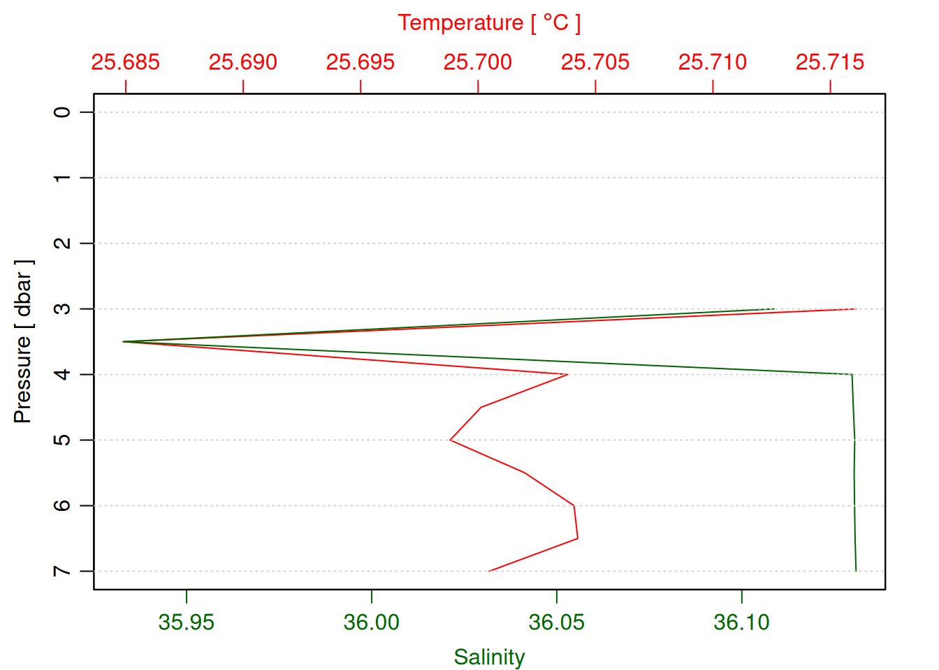 tryCatch({ oce::plotProfile(decimated_cast)# TODO: plot chl & do (prereq handle other_params in ctd_load_from_csv call above)}, error =function(e) {print("decimated cast not found")})