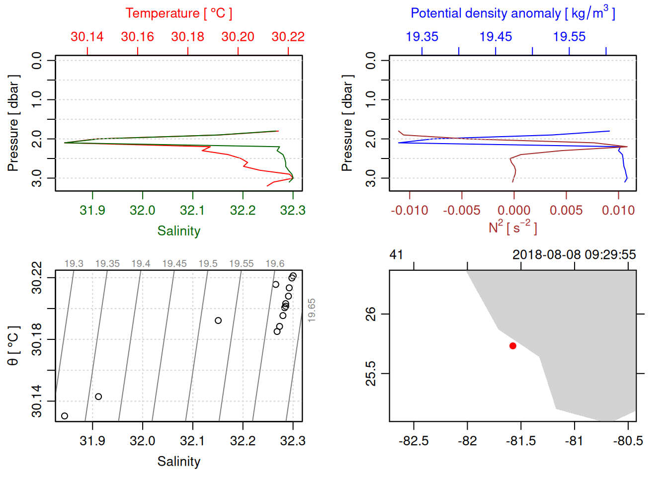 # TODO: Include param here that specifies to handle QC flags. This should be done before converting to a OCE object. QC flag columns are listed in [this spreadsheet](https://docs.google.com/spreadsheets/d/1uCxEmJRqErU-HCQiRQ1FpyiIqtNaGgMSBI0WvrtwBRU/edit?gid=137286311#gid=137286311) and are not supposed to be included in the oce object. QC param values are : # 1 good# 2 +/- 3*std_dev# 4 +/- 5*std_dev# 9 missing# Data column should be set to NA if corresponding QC column has value greater than threshold (recommended threshold is 5*std_dev).# Will need to loop through *_qc columns.# TODO: drop spikes (how? low-pass?).# TODO: combine replicate sensors (eg temp1 temp2).