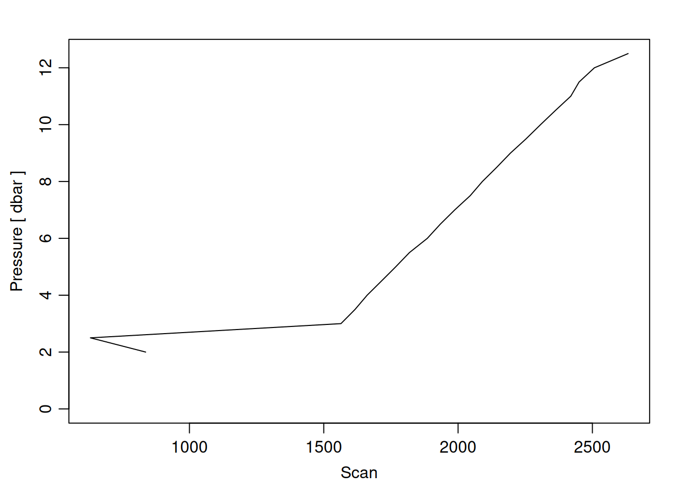 tryCatch({ trimmed_cast <-ctdTrim(cast) decimated_cast <-ctdDecimate(trimmed_cast, p =0.5)# plotting can cause the xlim failureplotScan(decimated_cast)# === export === cast_df <-as.data.frame(decimated_cast@data)# Add metadata cast_df <-mutate( cast_df,station = station_id,cruise_id = cruise_id )# drop NA rows left by cleaning cast_df <-subset(cast_df, !is.na(scan))# create folder if doesn't exist clean_data_loc <- here::here("data/02_clean")try(fs::dir_create(clean_data_loc))# save ctd to .csvwrite.csv(cast_df, glue("{clean_data_loc}/{params$cast_id}.csv"))}, error =function(e) {cat("\n=== CTD PROCESSING ERROR ===\n")cat("Cast ID:", params$cast_id, "\n")cat("Error message:\n", conditionMessage(e), "\n\n")# Safely inspect objects that might or might not exist when the error happenedif (exists("decimated_cast")) { df <-try(as.data.frame(decimated_cast@data), silent =TRUE)if (!inherits(df, "try-error")) {cat("Dataframe columns:\n")print(names(df))cat("\nSummary of key columns (scan, pressure, temperature, salinity if present):\n") known_cols <-intersect(c("scan", "pressure", "temp", "temperature", "salinity", "conductivity"), names(df))print(summary(df[known_cols], digits =3))cat("\nHead of dataframe:\n")print(head(df)) } else {cat("Could not extract dataframe from decimated_cast.\n") } } else {cat("decimated_cast was never created before the error.\n") }cat("\n=== END ERROR DEBUG INFO ===\n\n")})