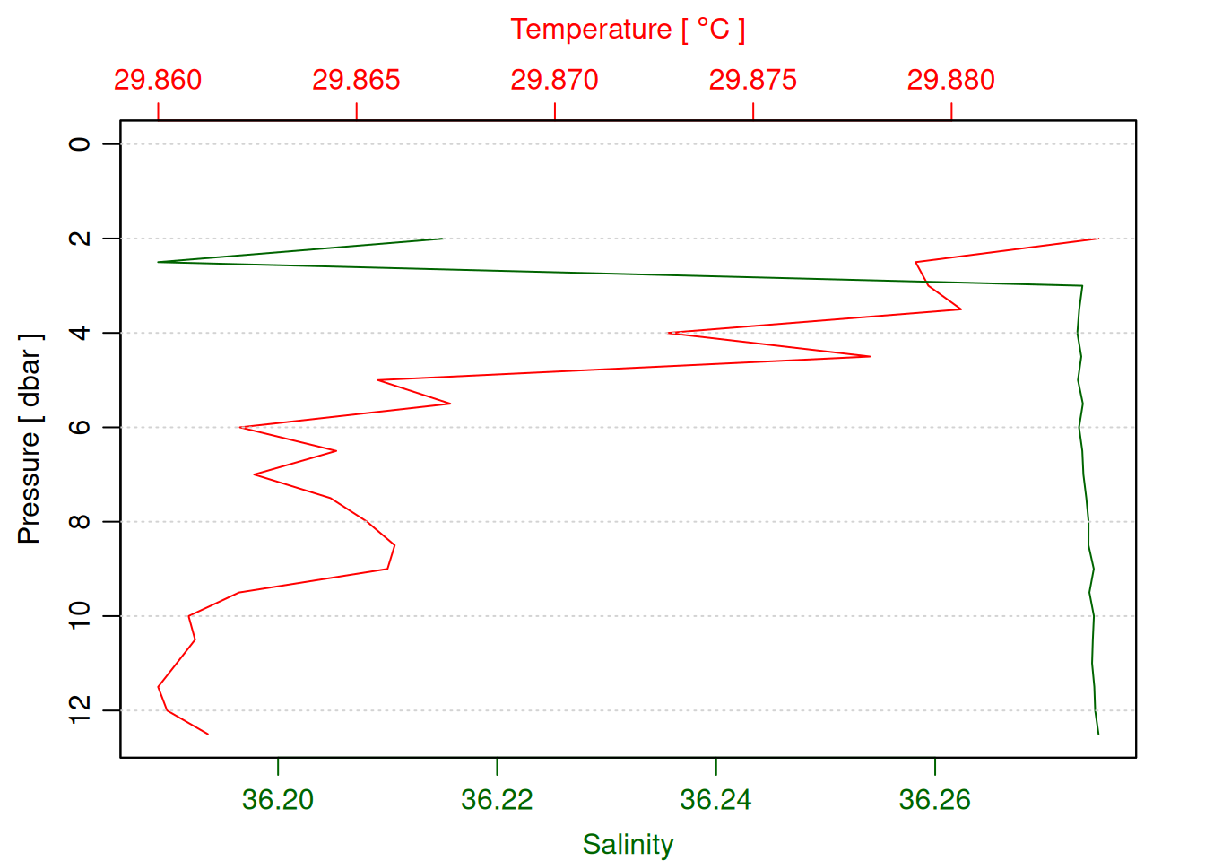 tryCatch({ oce::plotProfile(decimated_cast)# TODO: plot chl & do (prereq handle other_params in ctd_load_from_csv call above)}, error =function(e) {print("decimated cast not found")})