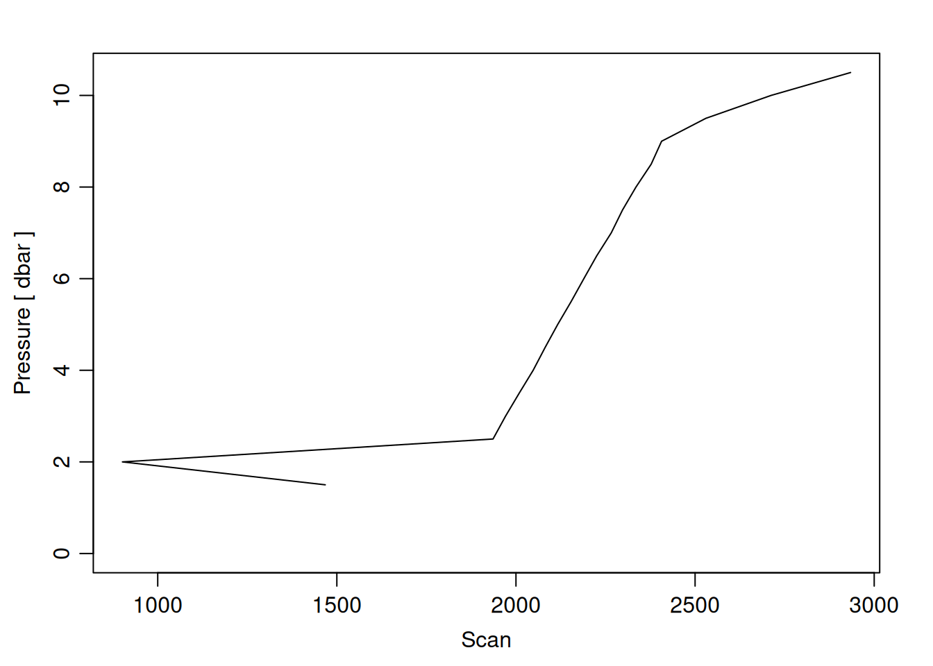 tryCatch({ trimmed_cast <-ctdTrim(cast) decimated_cast <-ctdDecimate(trimmed_cast, p =0.5)# plotting can cause the xlim failureplotScan(decimated_cast)# === export === cast_df <-as.data.frame(decimated_cast@data)# Add metadata cast_df <-mutate( cast_df,station = station_id,cruise_id = cruise_id )# drop NA rows left by cleaning cast_df <-subset(cast_df, !is.na(scan))# create folder if doesn't exist clean_data_loc <- here::here("data/02_clean")try(fs::dir_create(clean_data_loc))# save ctd to .csvwrite.csv(cast_df, glue("{clean_data_loc}/{params$cast_id}.csv"))}, error =function(e) {cat("\n=== CTD PROCESSING ERROR ===\n")cat("Cast ID:", params$cast_id, "\n")cat("Error message:\n", conditionMessage(e), "\n\n")# Safely inspect objects that might or might not exist when the error happenedif (exists("decimated_cast")) { df <-try(as.data.frame(decimated_cast@data), silent =TRUE)if (!inherits(df, "try-error")) {cat("Dataframe columns:\n")print(names(df))cat("\nSummary of key columns (scan, pressure, temperature, salinity if present):\n") known_cols <-intersect(c("scan", "pressure", "temp", "temperature", "salinity", "conductivity"), names(df))print(summary(df[known_cols], digits =3))cat("\nHead of dataframe:\n")print(head(df)) } else {cat("Could not extract dataframe from decimated_cast.\n") } } else {cat("decimated_cast was never created before the error.\n") }cat("\n=== END ERROR DEBUG INFO ===\n\n")})
