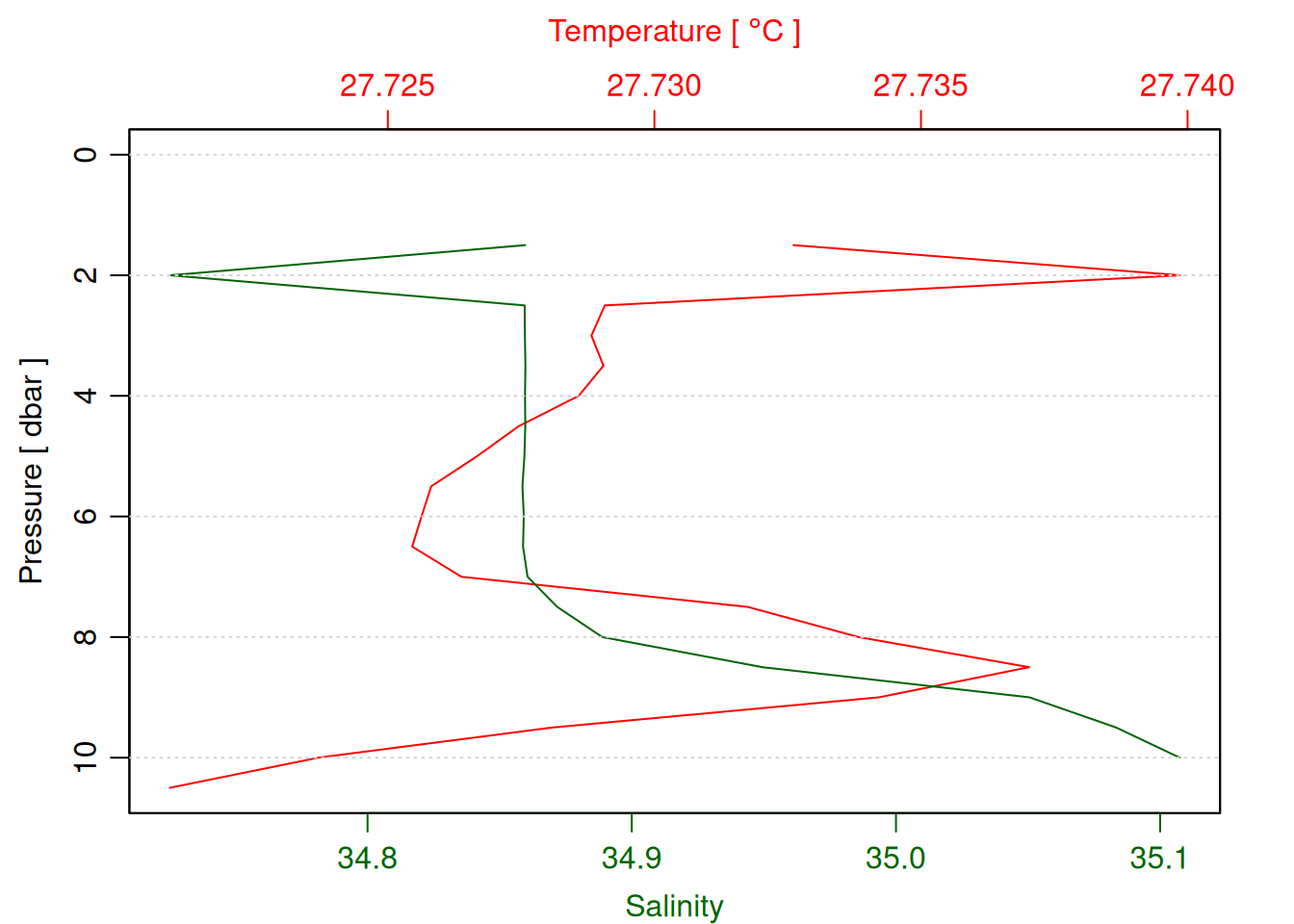 tryCatch({ oce::plotProfile(decimated_cast)# TODO: plot chl & do (prereq handle other_params in ctd_load_from_csv call above)}, error =function(e) {print("decimated cast not found")})