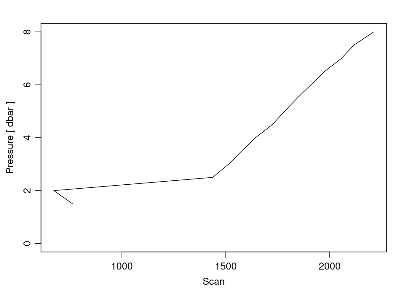 tryCatch({ trimmed_cast <-ctdTrim(cast) decimated_cast <-ctdDecimate(trimmed_cast, p =0.5)# plotting can cause the xlim failureplotScan(decimated_cast)# === export === cast_df <-as.data.frame(decimated_cast@data)# Add metadata cast_df <-mutate( cast_df,station = station_id,cruise_id = cruise_id )# drop NA rows left by cleaning cast_df <-subset(cast_df, !is.na(scan))# create folder if doesn't exist clean_data_loc <- here::here("data/02_clean")try(fs::dir_create(clean_data_loc))# save ctd to .csvwrite.csv(cast_df, glue("{clean_data_loc}/{params$cast_id}.csv"))}, error =function(e) {cat("\n=== CTD PROCESSING ERROR ===\n")cat("Cast ID:", params$cast_id, "\n")cat("Error message:\n", conditionMessage(e), "\n\n")# Safely inspect objects that might or might not exist when the error happenedif (exists("decimated_cast")) { df <-try(as.data.frame(decimated_cast@data), silent =TRUE)if (!inherits(df, "try-error")) {cat("Dataframe columns:\n")print(names(df))cat("\nSummary of key columns (scan, pressure, temperature, salinity if present):\n") known_cols <-intersect(c("scan", "pressure", "temp", "temperature", "salinity", "conductivity"), names(df))print(summary(df[known_cols], digits =3))cat("\nHead of dataframe:\n")print(head(df)) } else {cat("Could not extract dataframe from decimated_cast.\n") } } else {cat("decimated_cast was never created before the error.\n") }cat("\n=== END ERROR DEBUG INFO ===\n\n")})