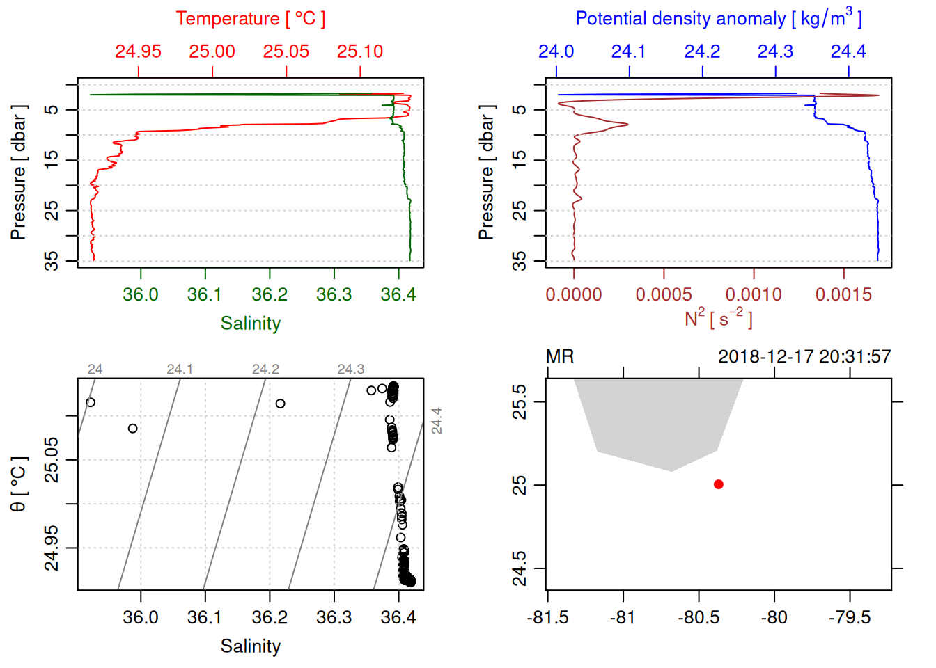 tryCatch({ trimmed_cast <-ctdTrim(cast) decimated_cast <-ctdDecimate(trimmed_cast, p =0.1)# plotting can cause the xlim failureplot(decimated_cast)# === export ===# Get the scan numbers that remain after cleaning cleaned_scans <- decimated_cast@data$scan# Load original raw data to keep all columns ctd_raw <- readr::read_csv(dataFile, show_col_types =FALSE)# Filter raw data to only include the cleaned scans cast_df <- ctd_raw %>%filter(!is.na(sea_water_pressure)) %>%# Remove rows without pressure datamutate(row_num =row_number()) %>%filter(row_num %in% cleaned_scans) %>%select(-row_num)# Add metadata cast_df <-mutate( cast_df,station = station_id,cruise_id = cruise_id )# Check if there are any rows in the cleaned dataif (nrow(cast_df) ==0) {cat("\n=== WARNING: NO DATA AFTER CLEANING ===\n")cat("Cast ID:", params$cast_id, "\n")cat("Station:", station_id, "\n")cat("Cruise:", cruise_id, "\n\n")cat("Raw data rows (with pressure):", sum(!is.na(ctd_raw$sea_water_pressure)), "\n")cat("Cleaned scans to keep:", length(cleaned_scans), "\n")cat("Resulting rows:", nrow(cast_df), "\n\n")cat("Raw data summary:\n")print(summary(ctd_raw[c("sea_water_pressure", "sea_water_temperature", "sea_water_salinity")]))cat("\nCleaned scans (first 20):\n")print(head(cleaned_scans, 20))cat("\n=== CSV FILE NOT CREATED (no data) ===\n\n") } else {# create folder if doesn't exist clean_data_loc <- here::here("data/02_clean")try(fs::dir_create(clean_data_loc))# save ctd to .csv (without row names/indices)write.csv(cast_df, glue("{clean_data_loc}/{params$cast_id}.csv"), row.names =FALSE)cat("Successfully saved", nrow(cast_df), "rows to", glue("{params$cast_id}.csv"), "\n") }}, error =function(e) {cat("\n=== CTD PROCESSING ERROR ===\n")cat("Cast ID:", params$cast_id, "\n")cat("Error message:\n", conditionMessage(e), "\n\n")# Safely inspect objects that might or might not exist when the error happenedif (exists("decimated_cast")) { df <-try(as.data.frame(decimated_cast@data), silent =TRUE)if (!inherits(df, "try-error")) {cat("Dataframe columns:\n")print(names(df))cat("\nSummary of key columns (scan, pressure, temperature, salinity if present):\n") known_cols <-intersect(c("scan", "pressure", "temp", "temperature", "salinity", "conductivity"), names(df))print(summary(df[known_cols], digits =3))cat("\nHead of dataframe:\n")print(head(df)) } else {cat("Could not extract dataframe from decimated_cast.\n") } } else {cat("decimated_cast was never created before the error.\n") }cat("\n=== END ERROR DEBUG INFO ===\n\n")})