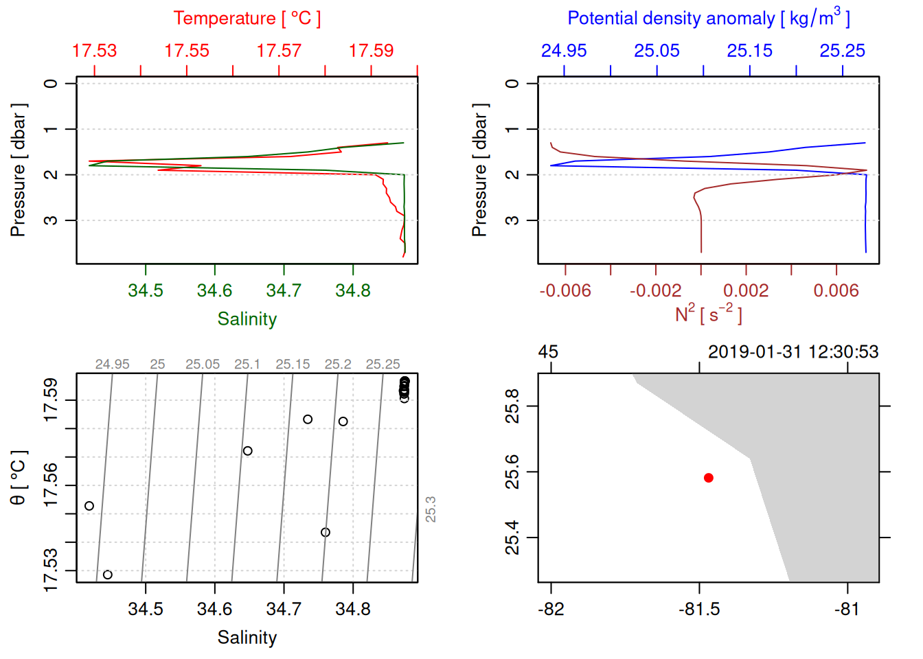 tryCatch({ trimmed_cast <-ctdTrim(cast) decimated_cast <-ctdDecimate(trimmed_cast, p =0.1)# plotting can cause the xlim failureplot(decimated_cast)# === export ===# Get the scan numbers that remain after cleaning cleaned_scans <- decimated_cast@data$scan# Load original raw data to keep all columns ctd_raw <- readr::read_csv(dataFile, show_col_types =FALSE)# Filter raw data to only include the cleaned scans cast_df <- ctd_raw %>%filter(!is.na(sea_water_pressure)) %>%# Remove rows without pressure datamutate(row_num =row_number()) %>%filter(row_num %in% cleaned_scans) %>%select(-row_num)# Add metadata cast_df <-mutate( cast_df,station = station_id,cruise_id = cruise_id )# Check if there are any rows in the cleaned dataif (nrow(cast_df) ==0) {cat("\n=== WARNING: NO DATA AFTER CLEANING ===\n")cat("Cast ID:", params$cast_id, "\n")cat("Station:", station_id, "\n")cat("Cruise:", cruise_id, "\n\n")cat("Raw data rows (with pressure):", sum(!is.na(ctd_raw$sea_water_pressure)), "\n")cat("Cleaned scans to keep:", length(cleaned_scans), "\n")cat("Resulting rows:", nrow(cast_df), "\n\n")cat("Raw data summary:\n")print(summary(ctd_raw[c("sea_water_pressure", "sea_water_temperature", "sea_water_salinity")]))cat("\nCleaned scans (first 20):\n")print(head(cleaned_scans, 20))cat("\n=== CSV FILE NOT CREATED (no data) ===\n\n") } else {# create folder if doesn't exist clean_data_loc <- here::here("data/02_clean")try(fs::dir_create(clean_data_loc))# save ctd to .csv (without row names/indices)write.csv(cast_df, glue("{clean_data_loc}/{params$cast_id}.csv"), row.names =FALSE)cat("Successfully saved", nrow(cast_df), "rows to", glue("{params$cast_id}.csv"), "\n") }}, error =function(e) {cat("\n=== CTD PROCESSING ERROR ===\n")cat("Cast ID:", params$cast_id, "\n")cat("Error message:\n", conditionMessage(e), "\n\n")# Safely inspect objects that might or might not exist when the error happenedif (exists("decimated_cast")) { df <-try(as.data.frame(decimated_cast@data), silent =TRUE)if (!inherits(df, "try-error")) {cat("Dataframe columns:\n")print(names(df))cat("\nSummary of key columns (scan, pressure, temperature, salinity if present):\n") known_cols <-intersect(c("scan", "pressure", "temp", "temperature", "salinity", "conductivity"), names(df))print(summary(df[known_cols], digits =3))cat("\nHead of dataframe:\n")print(head(df)) } else {cat("Could not extract dataframe from decimated_cast.\n") } } else {cat("decimated_cast was never created before the error.\n") }cat("\n=== END ERROR DEBUG INFO ===\n\n")})