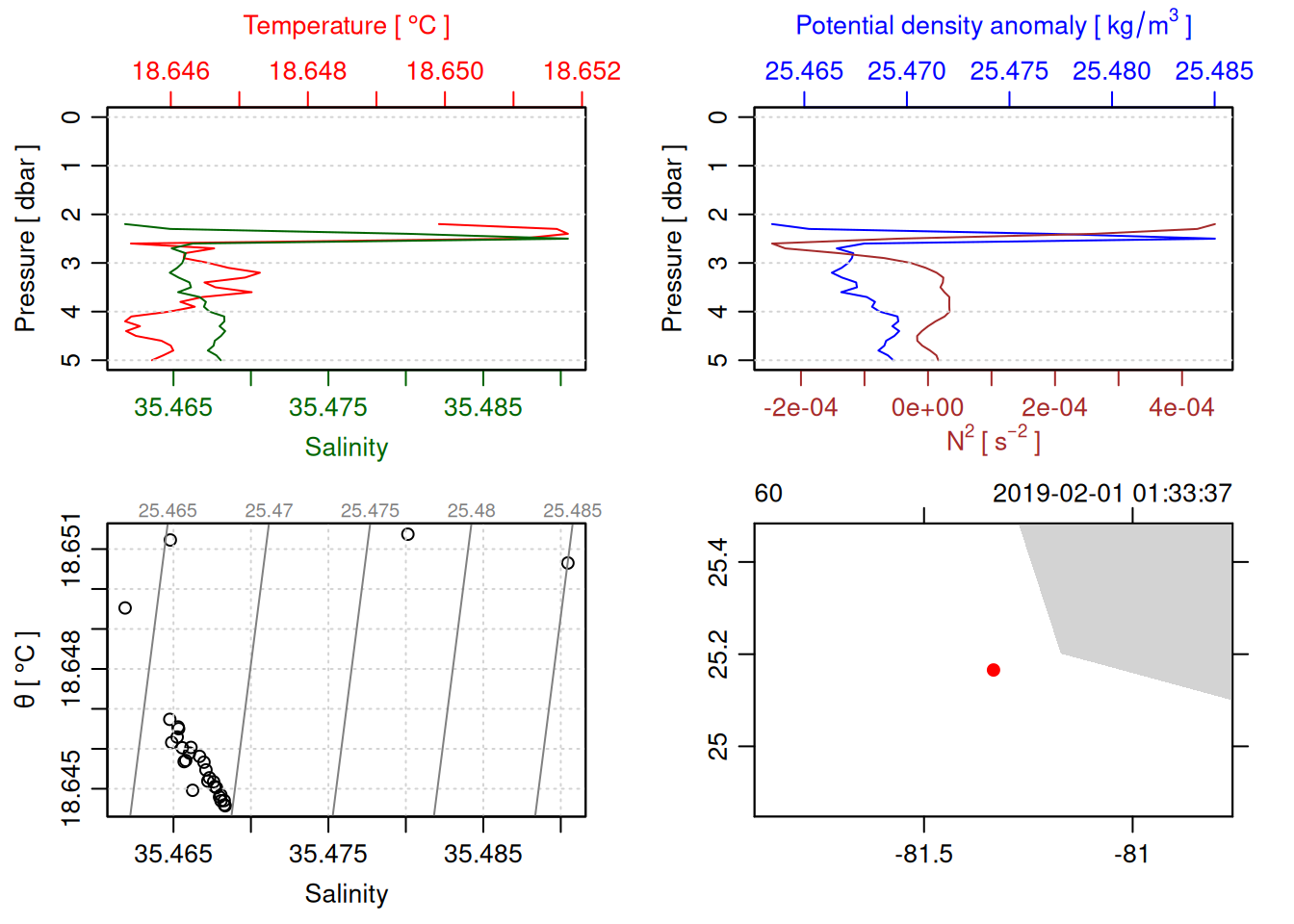 tryCatch({ trimmed_cast <-ctdTrim(cast) decimated_cast <-ctdDecimate(trimmed_cast, p =0.1)# plotting can cause the xlim failureplot(decimated_cast)# === export ===# Get the scan numbers that remain after cleaning cleaned_scans <- decimated_cast@data$scan# Load original raw data to keep all columns ctd_raw <- readr::read_csv(dataFile, show_col_types =FALSE)# Filter raw data to only include the cleaned scans cast_df <- ctd_raw %>%filter(!is.na(sea_water_pressure)) %>%# Remove rows without pressure datamutate(row_num =row_number()) %>%filter(row_num %in% cleaned_scans) %>%select(-row_num)# Add metadata cast_df <-mutate( cast_df,station = station_id,cruise_id = cruise_id )# Check if there are any rows in the cleaned dataif (nrow(cast_df) ==0) {cat("\n=== WARNING: NO DATA AFTER CLEANING ===\n")cat("Cast ID:", params$cast_id, "\n")cat("Station:", station_id, "\n")cat("Cruise:", cruise_id, "\n\n")cat("Raw data rows (with pressure):", sum(!is.na(ctd_raw$sea_water_pressure)), "\n")cat("Cleaned scans to keep:", length(cleaned_scans), "\n")cat("Resulting rows:", nrow(cast_df), "\n\n")cat("Raw data summary:\n")print(summary(ctd_raw[c("sea_water_pressure", "sea_water_temperature", "sea_water_salinity")]))cat("\nCleaned scans (first 20):\n")print(head(cleaned_scans, 20))cat("\n=== CSV FILE NOT CREATED (no data) ===\n\n") } else {# create folder if doesn't exist clean_data_loc <- here::here("data/02_clean")try(fs::dir_create(clean_data_loc))# save ctd to .csv (without row names/indices)write.csv(cast_df, glue("{clean_data_loc}/{params$cast_id}.csv"), row.names =FALSE)cat("Successfully saved", nrow(cast_df), "rows to", glue("{params$cast_id}.csv"), "\n") }}, error =function(e) {cat("\n=== CTD PROCESSING ERROR ===\n")cat("Cast ID:", params$cast_id, "\n")cat("Error message:\n", conditionMessage(e), "\n\n")# Safely inspect objects that might or might not exist when the error happenedif (exists("decimated_cast")) { df <-try(as.data.frame(decimated_cast@data), silent =TRUE)if (!inherits(df, "try-error")) {cat("Dataframe columns:\n")print(names(df))cat("\nSummary of key columns (scan, pressure, temperature, salinity if present):\n") known_cols <-intersect(c("scan", "pressure", "temp", "temperature", "salinity", "conductivity"), names(df))print(summary(df[known_cols], digits =3))cat("\nHead of dataframe:\n")print(head(df)) } else {cat("Could not extract dataframe from decimated_cast.\n") } } else {cat("decimated_cast was never created before the error.\n") }cat("\n=== END ERROR DEBUG INFO ===\n\n")})