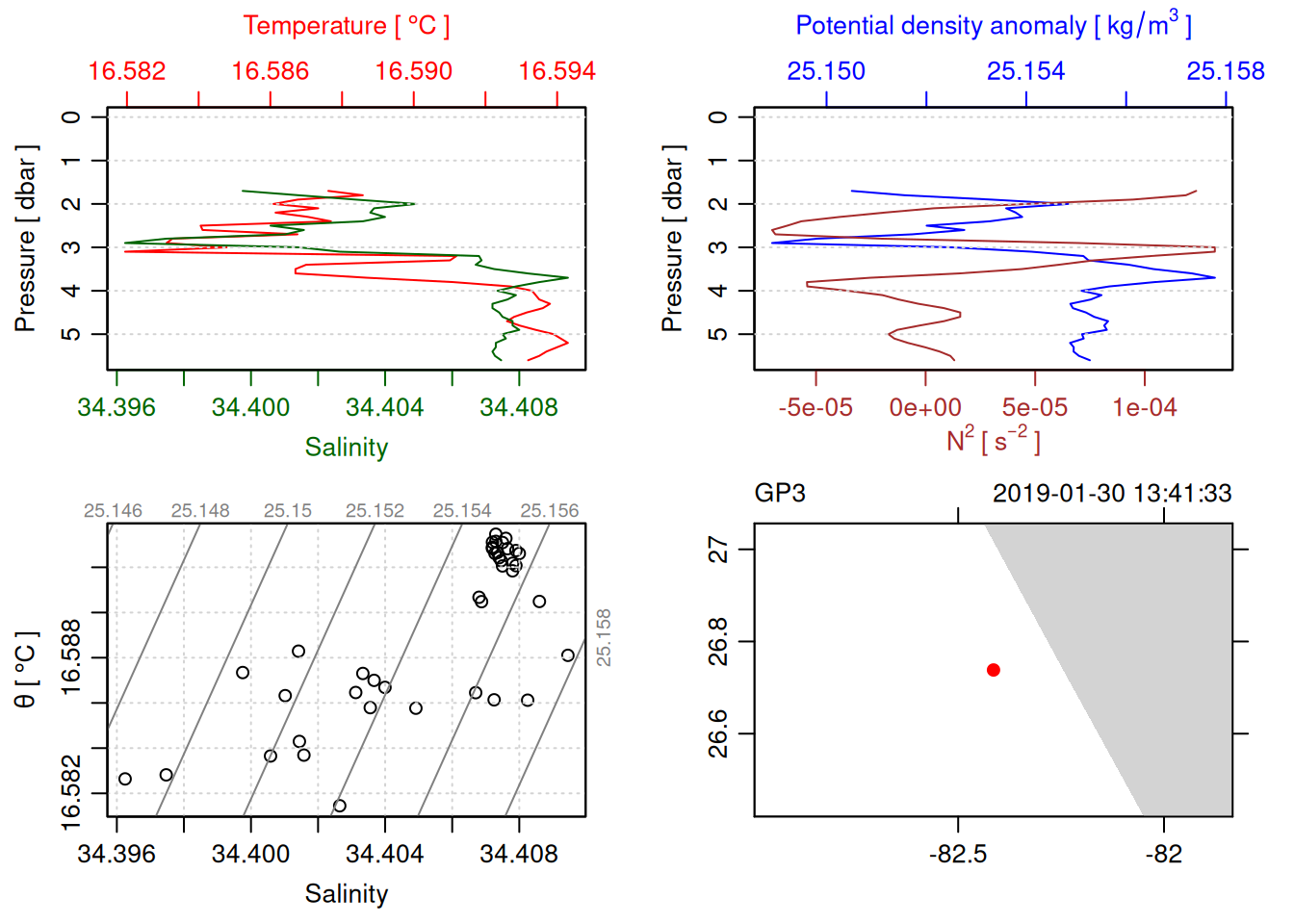 tryCatch({ trimmed_cast <-ctdTrim(cast) decimated_cast <-ctdDecimate(trimmed_cast, p =0.1)# plotting can cause the xlim failureplot(decimated_cast)# === export ===# Get the scan numbers that remain after cleaning cleaned_scans <- decimated_cast@data$scan# Load original raw data to keep all columns ctd_raw <- readr::read_csv(dataFile, show_col_types =FALSE)# Filter raw data to only include the cleaned scans cast_df <- ctd_raw %>%filter(!is.na(sea_water_pressure)) %>%# Remove rows without pressure datamutate(row_num =row_number()) %>%filter(row_num %in% cleaned_scans) %>%select(-row_num)# Add metadata cast_df <-mutate( cast_df,station = station_id,cruise_id = cruise_id )# Check if there are any rows in the cleaned dataif (nrow(cast_df) ==0) {cat("\n=== WARNING: NO DATA AFTER CLEANING ===\n")cat("Cast ID:", params$cast_id, "\n")cat("Station:", station_id, "\n")cat("Cruise:", cruise_id, "\n\n")cat("Raw data rows (with pressure):", sum(!is.na(ctd_raw$sea_water_pressure)), "\n")cat("Cleaned scans to keep:", length(cleaned_scans), "\n")cat("Resulting rows:", nrow(cast_df), "\n\n")cat("Raw data summary:\n")print(summary(ctd_raw[c("sea_water_pressure", "sea_water_temperature", "sea_water_salinity")]))cat("\nCleaned scans (first 20):\n")print(head(cleaned_scans, 20))cat("\n=== CSV FILE NOT CREATED (no data) ===\n\n") } else {# create folder if doesn't exist clean_data_loc <- here::here("data/02_clean")try(fs::dir_create(clean_data_loc))# save ctd to .csv (without row names/indices)write.csv(cast_df, glue("{clean_data_loc}/{params$cast_id}.csv"), row.names =FALSE)cat("Successfully saved", nrow(cast_df), "rows to", glue("{params$cast_id}.csv"), "\n") }}, error =function(e) {cat("\n=== CTD PROCESSING ERROR ===\n")cat("Cast ID:", params$cast_id, "\n")cat("Error message:\n", conditionMessage(e), "\n\n")# Safely inspect objects that might or might not exist when the error happenedif (exists("decimated_cast")) { df <-try(as.data.frame(decimated_cast@data), silent =TRUE)if (!inherits(df, "try-error")) {cat("Dataframe columns:\n")print(names(df))cat("\nSummary of key columns (scan, pressure, temperature, salinity if present):\n") known_cols <-intersect(c("scan", "pressure", "temp", "temperature", "salinity", "conductivity"), names(df))print(summary(df[known_cols], digits =3))cat("\nHead of dataframe:\n")print(head(df)) } else {cat("Could not extract dataframe from decimated_cast.\n") } } else {cat("decimated_cast was never created before the error.\n") }cat("\n=== END ERROR DEBUG INFO ===\n\n")})