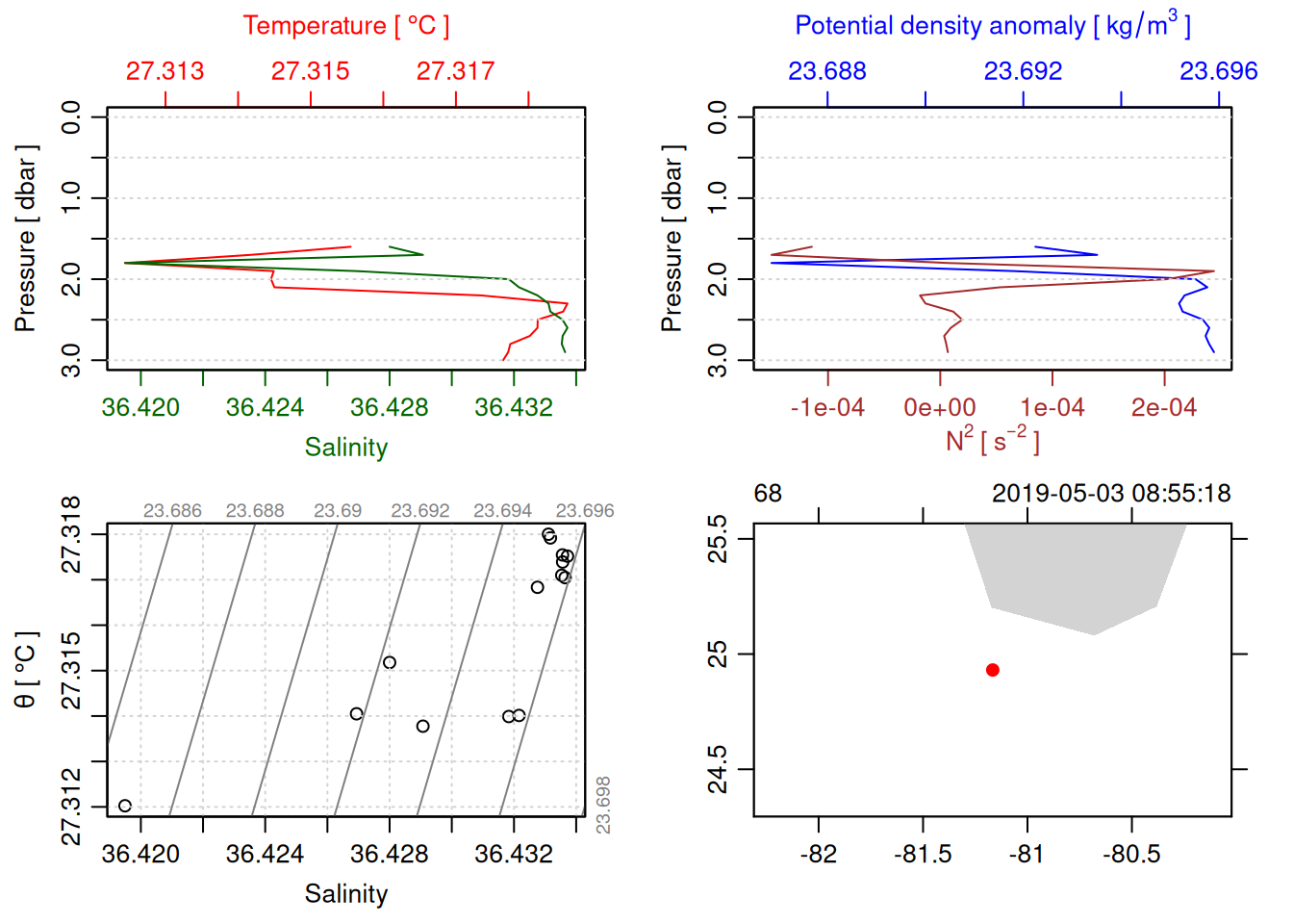tryCatch({ trimmed_cast <-ctdTrim(cast) decimated_cast <-ctdDecimate(trimmed_cast, p =0.1)# plotting can cause the xlim failureplot(decimated_cast)# === export ===# Get the scan numbers that remain after cleaning cleaned_scans <- decimated_cast@data$scan# Load original raw data to keep all columns ctd_raw <- readr::read_csv(dataFile, show_col_types =FALSE)# Filter raw data to only include the cleaned scans cast_df <- ctd_raw %>%filter(!is.na(sea_water_pressure)) %>%# Remove rows without pressure datamutate(row_num =row_number()) %>%filter(row_num %in% cleaned_scans) %>%select(-row_num)# Add metadata cast_df <-mutate( cast_df,station = station_id,cruise_id = cruise_id )# Check if there are any rows in the cleaned dataif (nrow(cast_df) ==0) {cat("\n=== WARNING: NO DATA AFTER CLEANING ===\n")cat("Cast ID:", params$cast_id, "\n")cat("Station:", station_id, "\n")cat("Cruise:", cruise_id, "\n\n")cat("Raw data rows (with pressure):", sum(!is.na(ctd_raw$sea_water_pressure)), "\n")cat("Cleaned scans to keep:", length(cleaned_scans), "\n")cat("Resulting rows:", nrow(cast_df), "\n\n")cat("Raw data summary:\n")print(summary(ctd_raw[c("sea_water_pressure", "sea_water_temperature", "sea_water_salinity")]))cat("\nCleaned scans (first 20):\n")print(head(cleaned_scans, 20))cat("\n=== CSV FILE NOT CREATED (no data) ===\n\n") } else {# create folder if doesn't exist clean_data_loc <- here::here("data/02_clean")try(fs::dir_create(clean_data_loc))# save ctd to .csv (without row names/indices)write.csv(cast_df, glue("{clean_data_loc}/{params$cast_id}.csv"), row.names =FALSE)cat("Successfully saved", nrow(cast_df), "rows to", glue("{params$cast_id}.csv"), "\n") }}, error =function(e) {cat("\n=== CTD PROCESSING ERROR ===\n")cat("Cast ID:", params$cast_id, "\n")cat("Error message:\n", conditionMessage(e), "\n\n")# Safely inspect objects that might or might not exist when the error happenedif (exists("decimated_cast")) { df <-try(as.data.frame(decimated_cast@data), silent =TRUE)if (!inherits(df, "try-error")) {cat("Dataframe columns:\n")print(names(df))cat("\nSummary of key columns (scan, pressure, temperature, salinity if present):\n") known_cols <-intersect(c("scan", "pressure", "temp", "temperature", "salinity", "conductivity"), names(df))print(summary(df[known_cols], digits =3))cat("\nHead of dataframe:\n")print(head(df)) } else {cat("Could not extract dataframe from decimated_cast.\n") } } else {cat("decimated_cast was never created before the error.\n") }cat("\n=== END ERROR DEBUG INFO ===\n\n")})