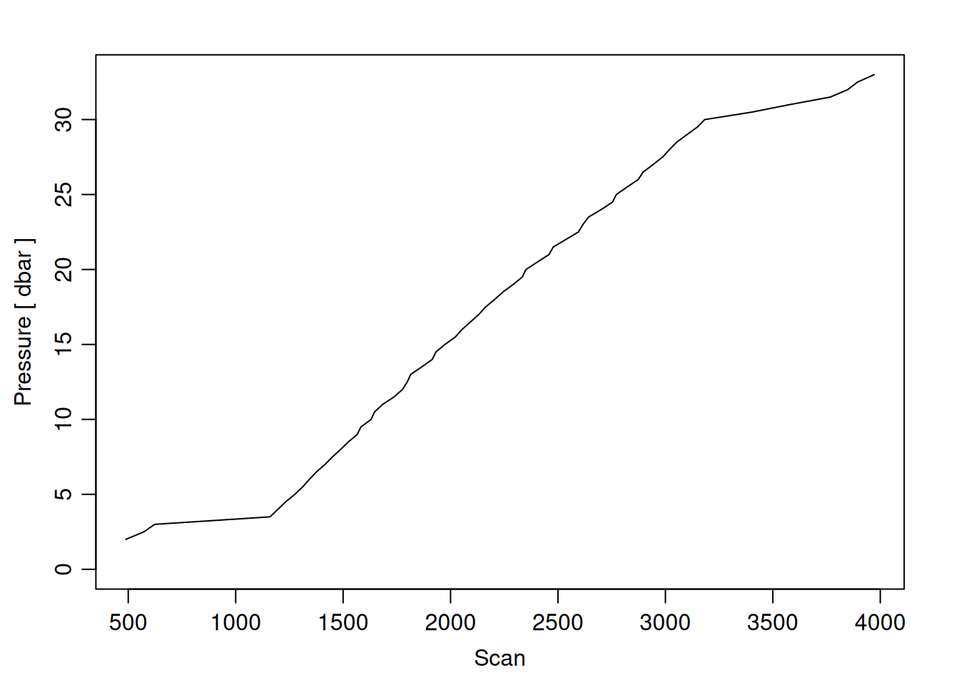 tryCatch({ trimmed_cast <-ctdTrim(cast) decimated_cast <-ctdDecimate(trimmed_cast, p =0.5)# plotting can cause the xlim failureplotScan(decimated_cast)# === export === cast_df <-as.data.frame(decimated_cast@data)# Add metadata cast_df <-mutate( cast_df,station = station_id,cruise_id = cruise_id )# drop NA rows left by cleaning cast_df <-subset(cast_df, !is.na(scan))# create folder if doesn't exist clean_data_loc <- here::here("data/02_clean")try(fs::dir_create(clean_data_loc))# save ctd to .csvwrite.csv(cast_df, glue("{clean_data_loc}/{params$cast_id}.csv"))}, error =function(e) {cat("\n=== CTD PROCESSING ERROR ===\n")cat("Cast ID:", params$cast_id, "\n")cat("Error message:\n", conditionMessage(e), "\n\n")# Safely inspect objects that might or might not exist when the error happenedif (exists("decimated_cast")) { df <-try(as.data.frame(decimated_cast@data), silent =TRUE)if (!inherits(df, "try-error")) {cat("Dataframe columns:\n")print(names(df))cat("\nSummary of key columns (scan, pressure, temperature, salinity if present):\n") known_cols <-intersect(c("scan", "pressure", "temp", "temperature", "salinity", "conductivity"), names(df))print(summary(df[known_cols], digits =3))cat("\nHead of dataframe:\n")print(head(df)) } else {cat("Could not extract dataframe from decimated_cast.\n") } } else {cat("decimated_cast was never created before the error.\n") }cat("\n=== END ERROR DEBUG INFO ===\n\n")})