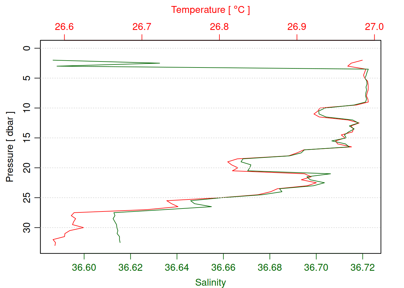 tryCatch({ oce::plotProfile(decimated_cast)# TODO: plot chl & do (prereq handle other_params in ctd_load_from_csv call above)}, error =function(e) {print("decimated cast not found")})