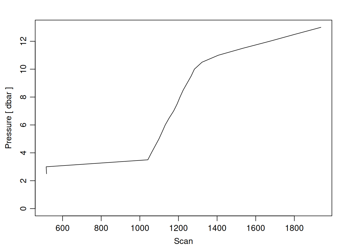 tryCatch({ trimmed_cast <-ctdTrim(cast) decimated_cast <-ctdDecimate(trimmed_cast, p =0.5)# plotting can cause the xlim failureplotScan(decimated_cast)# === export === cast_df <-as.data.frame(decimated_cast@data)# Add metadata cast_df <-mutate( cast_df,station = station_id,cruise_id = cruise_id )# drop NA rows left by cleaning cast_df <-subset(cast_df, !is.na(scan))# create folder if doesn't exist clean_data_loc <- here::here("data/02_clean")try(fs::dir_create(clean_data_loc))# save ctd to .csvwrite.csv(cast_df, glue("{clean_data_loc}/{params$cast_id}.csv"))}, error =function(e) {cat("\n=== CTD PROCESSING ERROR ===\n")cat("Cast ID:", params$cast_id, "\n")cat("Error message:\n", conditionMessage(e), "\n\n")# Safely inspect objects that might or might not exist when the error happenedif (exists("decimated_cast")) { df <-try(as.data.frame(decimated_cast@data), silent =TRUE)if (!inherits(df, "try-error")) {cat("Dataframe columns:\n")print(names(df))cat("\nSummary of key columns (scan, pressure, temperature, salinity if present):\n") known_cols <-intersect(c("scan", "pressure", "temp", "temperature", "salinity", "conductivity"), names(df))print(summary(df[known_cols], digits =3))cat("\nHead of dataframe:\n")print(head(df)) } else {cat("Could not extract dataframe from decimated_cast.\n") } } else {cat("decimated_cast was never created before the error.\n") }cat("\n=== END ERROR DEBUG INFO ===\n\n")})