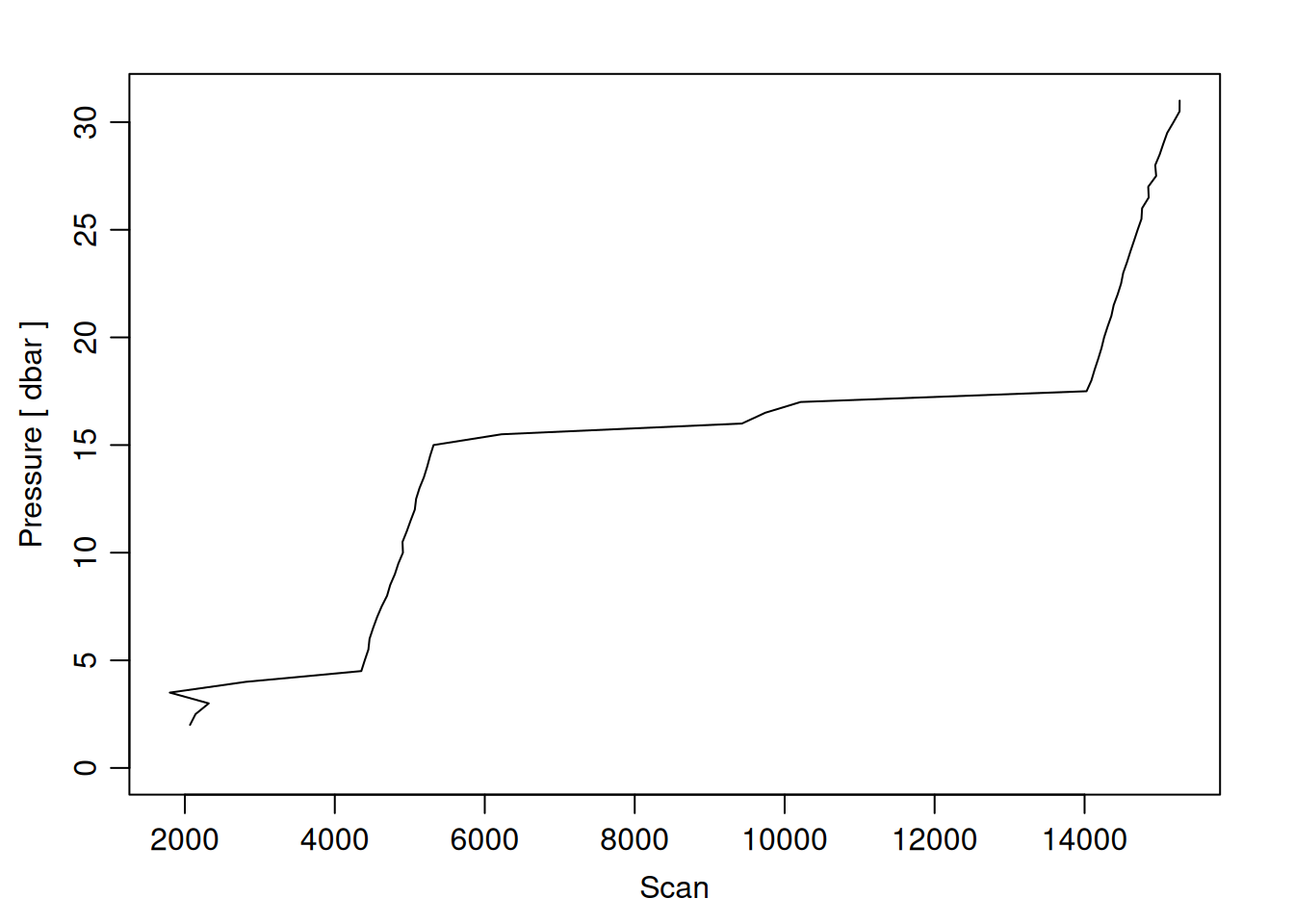 tryCatch({ trimmed_cast <-ctdTrim(cast) decimated_cast <-ctdDecimate(trimmed_cast, p =0.5)# plotting can cause the xlim failureplotScan(decimated_cast)# === export === cast_df <-as.data.frame(decimated_cast@data)# Add metadata cast_df <-mutate( cast_df,station = station_id,cruise_id = cruise_id )# drop NA rows left by cleaning cast_df <-subset(cast_df, !is.na(scan))# create folder if doesn't exist clean_data_loc <- here::here("data/02_clean")try(fs::dir_create(clean_data_loc))# save ctd to .csvwrite.csv(cast_df, glue("{clean_data_loc}/{params$cast_id}.csv"))}, error =function(e) {cat("\n=== CTD PROCESSING ERROR ===\n")cat("Cast ID:", params$cast_id, "\n")cat("Error message:\n", conditionMessage(e), "\n\n")# Safely inspect objects that might or might not exist when the error happenedif (exists("decimated_cast")) { df <-try(as.data.frame(decimated_cast@data), silent =TRUE)if (!inherits(df, "try-error")) {cat("Dataframe columns:\n")print(names(df))cat("\nSummary of key columns (scan, pressure, temperature, salinity if present):\n") known_cols <-intersect(c("scan", "pressure", "temp", "temperature", "salinity", "conductivity"), names(df))print(summary(df[known_cols], digits =3))cat("\nHead of dataframe:\n")print(head(df)) } else {cat("Could not extract dataframe from decimated_cast.\n") } } else {cat("decimated_cast was never created before the error.\n") }cat("\n=== END ERROR DEBUG INFO ===\n\n")})