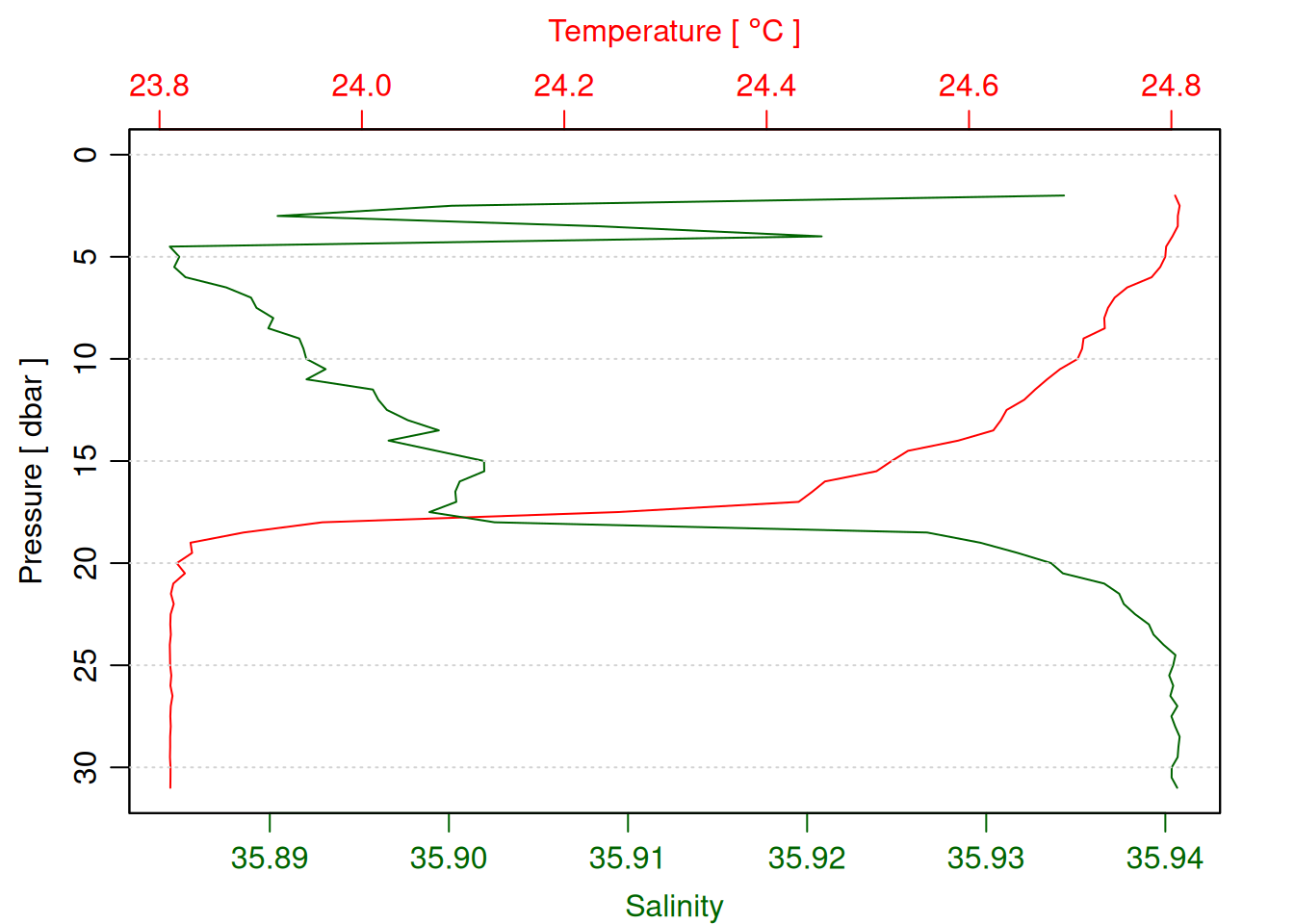 tryCatch({ oce::plotProfile(decimated_cast)# TODO: plot chl & do (prereq handle other_params in ctd_load_from_csv call above)}, error =function(e) {print("decimated cast not found")})