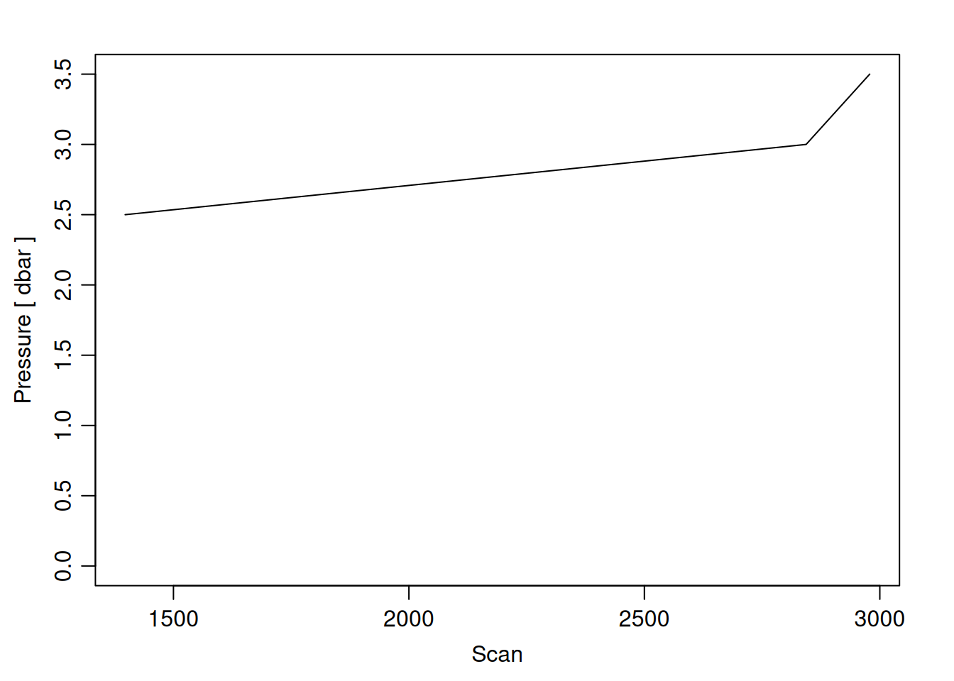 tryCatch({ trimmed_cast <-ctdTrim(cast) decimated_cast <-ctdDecimate(trimmed_cast, p =0.5)# plotting can cause the xlim failureplotScan(decimated_cast)# === export === cast_df <-as.data.frame(decimated_cast@data)# Add metadata cast_df <-mutate( cast_df,station = station_id,cruise_id = cruise_id )# drop NA rows left by cleaning cast_df <-subset(cast_df, !is.na(scan))# create folder if doesn't exist clean_data_loc <- here::here("data/02_clean")try(fs::dir_create(clean_data_loc))# save ctd to .csvwrite.csv(cast_df, glue("{clean_data_loc}/{params$cast_id}.csv"))}, error =function(e) {cat("\n=== CTD PROCESSING ERROR ===\n")cat("Cast ID:", params$cast_id, "\n")cat("Error message:\n", conditionMessage(e), "\n\n")# Safely inspect objects that might or might not exist when the error happenedif (exists("decimated_cast")) { df <-try(as.data.frame(decimated_cast@data), silent =TRUE)if (!inherits(df, "try-error")) {cat("Dataframe columns:\n")print(names(df))cat("\nSummary of key columns (scan, pressure, temperature, salinity if present):\n") known_cols <-intersect(c("scan", "pressure", "temp", "temperature", "salinity", "conductivity"), names(df))print(summary(df[known_cols], digits =3))cat("\nHead of dataframe:\n")print(head(df)) } else {cat("Could not extract dataframe from decimated_cast.\n") } } else {cat("decimated_cast was never created before the error.\n") }cat("\n=== END ERROR DEBUG INFO ===\n\n")})