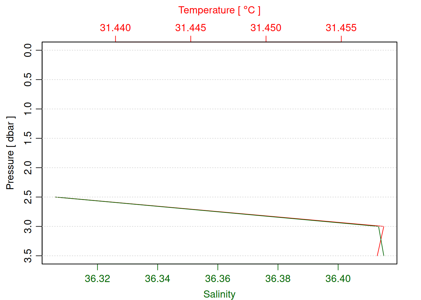 tryCatch({ oce::plotProfile(decimated_cast)# TODO: plot chl & do (prereq handle other_params in ctd_load_from_csv call above)}, error =function(e) {print("decimated cast not found")})
