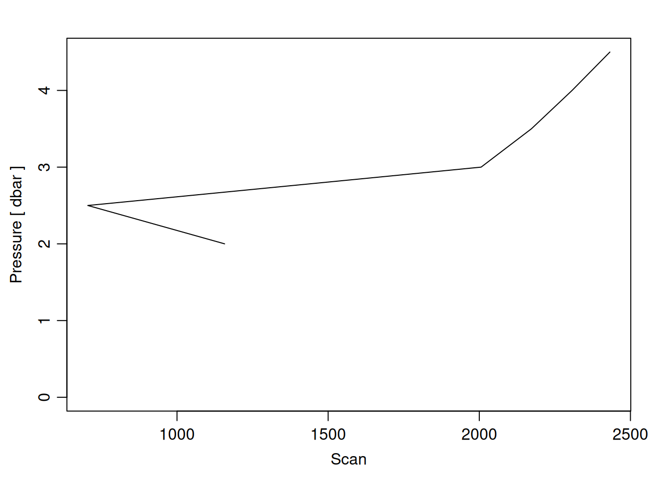 tryCatch({ trimmed_cast <-ctdTrim(cast) decimated_cast <-ctdDecimate(trimmed_cast, p =0.5)# plotting can cause the xlim failureplotScan(decimated_cast)# === export === cast_df <-as.data.frame(decimated_cast@data)# Add metadata cast_df <-mutate( cast_df,station = station_id,cruise_id = cruise_id )# drop NA rows left by cleaning cast_df <-subset(cast_df, !is.na(scan))# create folder if doesn't exist clean_data_loc <- here::here("data/02_clean")try(fs::dir_create(clean_data_loc))# save ctd to .csvwrite.csv(cast_df, glue("{clean_data_loc}/{params$cast_id}.csv"))}, error =function(e) {cat("\n=== CTD PROCESSING ERROR ===\n")cat("Cast ID:", params$cast_id, "\n")cat("Error message:\n", conditionMessage(e), "\n\n")# Safely inspect objects that might or might not exist when the error happenedif (exists("decimated_cast")) { df <-try(as.data.frame(decimated_cast@data), silent =TRUE)if (!inherits(df, "try-error")) {cat("Dataframe columns:\n")print(names(df))cat("\nSummary of key columns (scan, pressure, temperature, salinity if present):\n") known_cols <-intersect(c("scan", "pressure", "temp", "temperature", "salinity", "conductivity"), names(df))print(summary(df[known_cols], digits =3))cat("\nHead of dataframe:\n")print(head(df)) } else {cat("Could not extract dataframe from decimated_cast.\n") } } else {cat("decimated_cast was never created before the error.\n") }cat("\n=== END ERROR DEBUG INFO ===\n\n")})