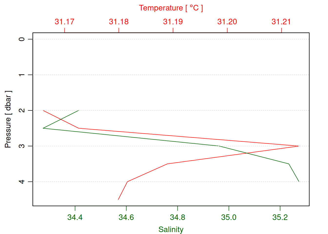 tryCatch({ oce::plotProfile(decimated_cast)# TODO: plot chl & do (prereq handle other_params in ctd_load_from_csv call above)}, error =function(e) {print("decimated cast not found")})