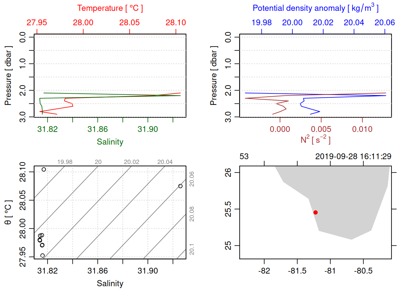 tryCatch({ trimmed_cast <-ctdTrim(cast) decimated_cast <-ctdDecimate(trimmed_cast, p =0.1)# plotting can cause the xlim failureplot(decimated_cast)# === export ===# Get the scan numbers that remain after cleaning cleaned_scans <- decimated_cast@data$scan# Load original raw data to keep all columns ctd_raw <- readr::read_csv(dataFile, show_col_types =FALSE)# Filter raw data to only include the cleaned scans cast_df <- ctd_raw %>%filter(!is.na(sea_water_pressure)) %>%# Remove rows without pressure datamutate(row_num =row_number()) %>%filter(row_num %in% cleaned_scans) %>%select(-row_num)# Add metadata cast_df <-mutate( cast_df,station = station_id,cruise_id = cruise_id )# Check if there are any rows in the cleaned dataif (nrow(cast_df) ==0) {cat("\n=== WARNING: NO DATA AFTER CLEANING ===\n")cat("Cast ID:", params$cast_id, "\n")cat("Station:", station_id, "\n")cat("Cruise:", cruise_id, "\n\n")cat("Raw data rows (with pressure):", sum(!is.na(ctd_raw$sea_water_pressure)), "\n")cat("Cleaned scans to keep:", length(cleaned_scans), "\n")cat("Resulting rows:", nrow(cast_df), "\n\n")cat("Raw data summary:\n")print(summary(ctd_raw[c("sea_water_pressure", "sea_water_temperature", "sea_water_salinity")]))cat("\nCleaned scans (first 20):\n")print(head(cleaned_scans, 20))cat("\n=== CSV FILE NOT CREATED (no data) ===\n\n") } else {# create folder if doesn't exist clean_data_loc <- here::here("data/02_clean")try(fs::dir_create(clean_data_loc))# save ctd to .csv (without row names/indices)write.csv(cast_df, glue("{clean_data_loc}/{params$cast_id}.csv"), row.names =FALSE)cat("Successfully saved", nrow(cast_df), "rows to", glue("{params$cast_id}.csv"), "\n") }}, error =function(e) {cat("\n=== CTD PROCESSING ERROR ===\n")cat("Cast ID:", params$cast_id, "\n")cat("Error message:\n", conditionMessage(e), "\n\n")# Safely inspect objects that might or might not exist when the error happenedif (exists("decimated_cast")) { df <-try(as.data.frame(decimated_cast@data), silent =TRUE)if (!inherits(df, "try-error")) {cat("Dataframe columns:\n")print(names(df))cat("\nSummary of key columns (scan, pressure, temperature, salinity if present):\n") known_cols <-intersect(c("scan", "pressure", "temp", "temperature", "salinity", "conductivity"), names(df))print(summary(df[known_cols], digits =3))cat("\nHead of dataframe:\n")print(head(df)) } else {cat("Could not extract dataframe from decimated_cast.\n") } } else {cat("decimated_cast was never created before the error.\n") }cat("\n=== END ERROR DEBUG INFO ===\n\n")})