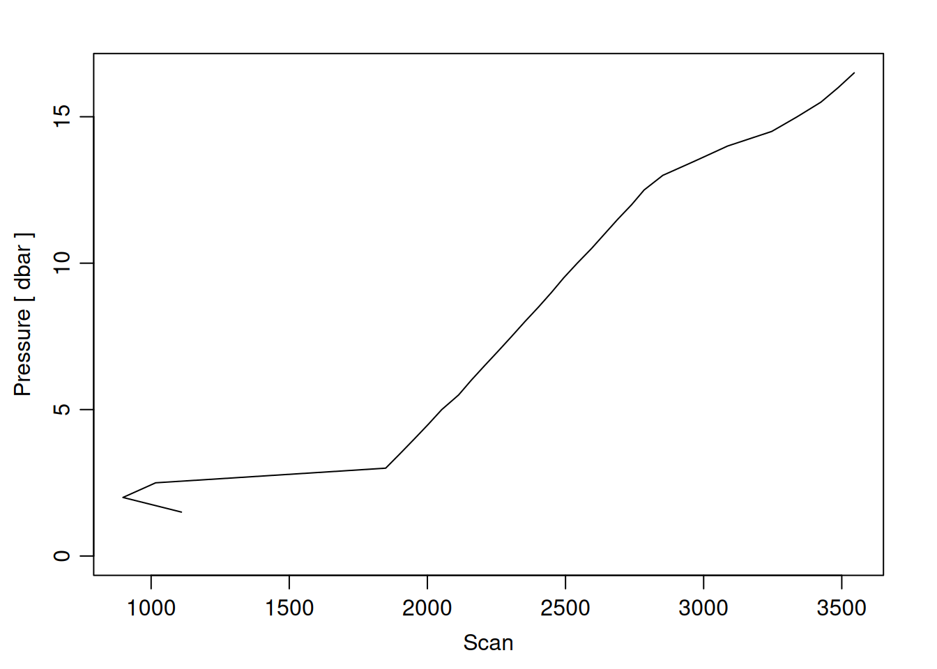 tryCatch({ trimmed_cast <-ctdTrim(cast) decimated_cast <-ctdDecimate(trimmed_cast, p =0.5)# plotting can cause the xlim failureplotScan(decimated_cast)# === export === cast_df <-as.data.frame(decimated_cast@data)# Add metadata cast_df <-mutate( cast_df,station = station_id,cruise_id = cruise_id )# drop NA rows left by cleaning cast_df <-subset(cast_df, !is.na(scan))# create folder if doesn't exist clean_data_loc <- here::here("data/02_clean")try(fs::dir_create(clean_data_loc))# save ctd to .csvwrite.csv(cast_df, glue("{clean_data_loc}/{params$cast_id}.csv"))}, error =function(e) {cat("\n=== CTD PROCESSING ERROR ===\n")cat("Cast ID:", params$cast_id, "\n")cat("Error message:\n", conditionMessage(e), "\n\n")# Safely inspect objects that might or might not exist when the error happenedif (exists("decimated_cast")) { df <-try(as.data.frame(decimated_cast@data), silent =TRUE)if (!inherits(df, "try-error")) {cat("Dataframe columns:\n")print(names(df))cat("\nSummary of key columns (scan, pressure, temperature, salinity if present):\n") known_cols <-intersect(c("scan", "pressure", "temp", "temperature", "salinity", "conductivity"), names(df))print(summary(df[known_cols], digits =3))cat("\nHead of dataframe:\n")print(head(df)) } else {cat("Could not extract dataframe from decimated_cast.\n") } } else {cat("decimated_cast was never created before the error.\n") }cat("\n=== END ERROR DEBUG INFO ===\n\n")})