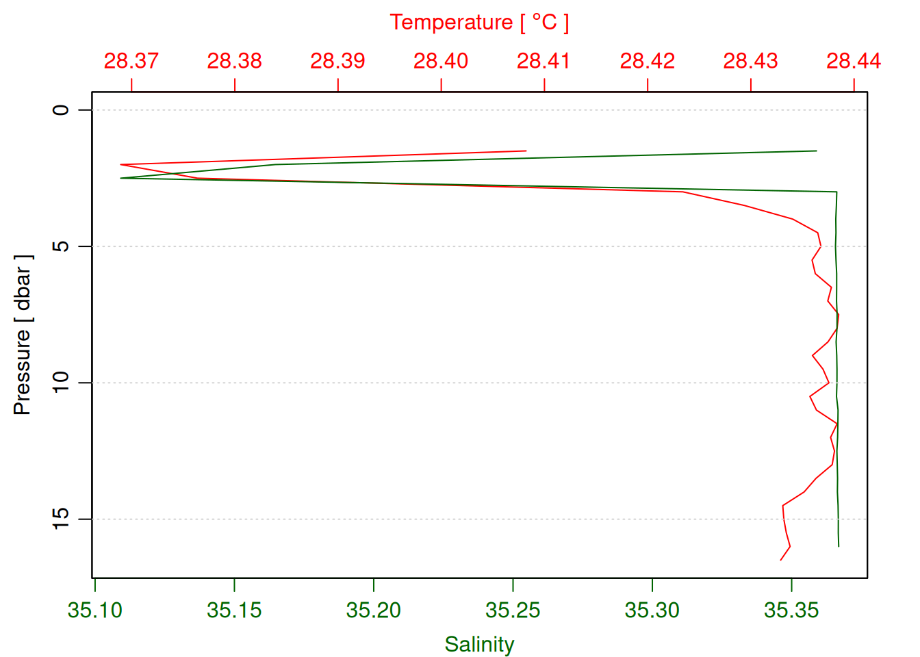 tryCatch({ oce::plotProfile(decimated_cast)# TODO: plot chl & do (prereq handle other_params in ctd_load_from_csv call above)}, error =function(e) {print("decimated cast not found")})