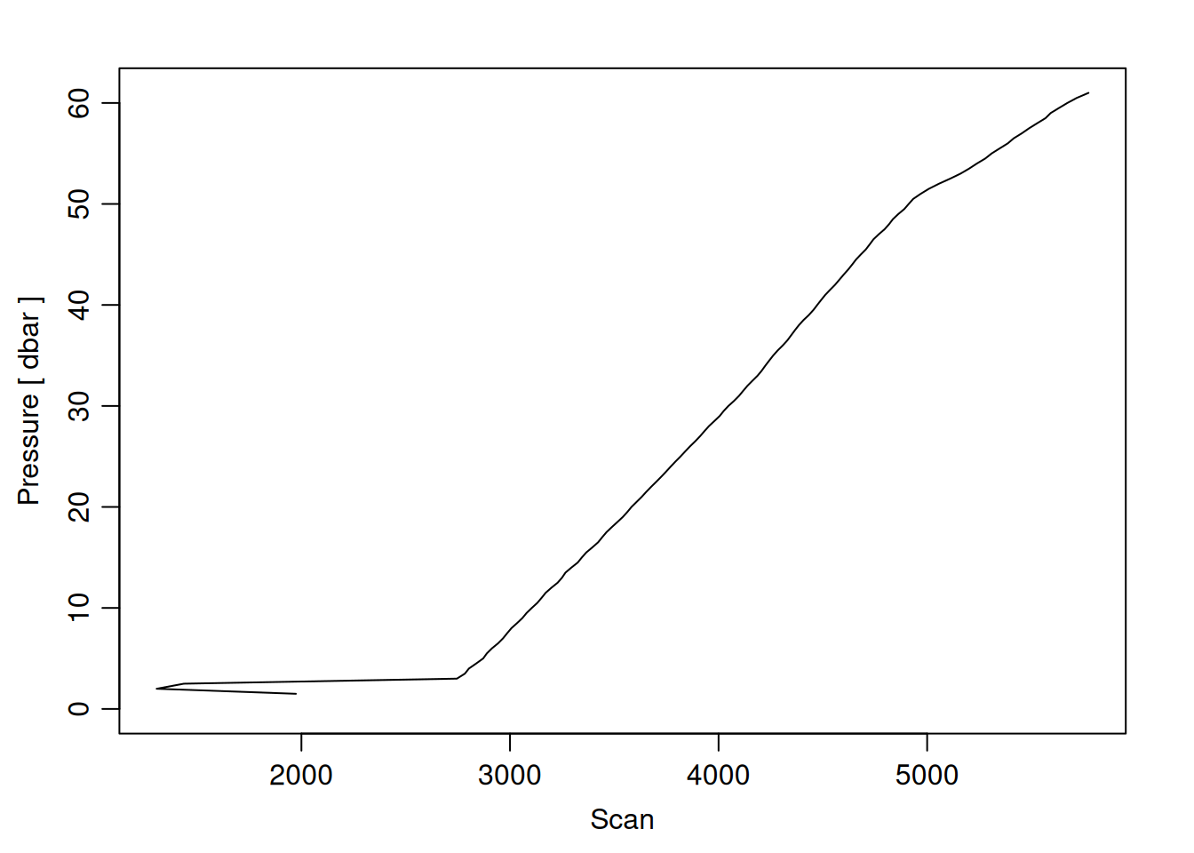 tryCatch({ trimmed_cast <-ctdTrim(cast) decimated_cast <-ctdDecimate(trimmed_cast, p =0.5)# plotting can cause the xlim failureplotScan(decimated_cast)# === export === cast_df <-as.data.frame(decimated_cast@data)# Add metadata cast_df <-mutate( cast_df,station = station_id,cruise_id = cruise_id )# drop NA rows left by cleaning cast_df <-subset(cast_df, !is.na(scan))# create folder if doesn't exist clean_data_loc <- here::here("data/02_clean")try(fs::dir_create(clean_data_loc))# save ctd to .csvwrite.csv(cast_df, glue("{clean_data_loc}/{params$cast_id}.csv"))}, error =function(e) {cat("\n=== CTD PROCESSING ERROR ===\n")cat("Cast ID:", params$cast_id, "\n")cat("Error message:\n", conditionMessage(e), "\n\n")# Safely inspect objects that might or might not exist when the error happenedif (exists("decimated_cast")) { df <-try(as.data.frame(decimated_cast@data), silent =TRUE)if (!inherits(df, "try-error")) {cat("Dataframe columns:\n")print(names(df))cat("\nSummary of key columns (scan, pressure, temperature, salinity if present):\n") known_cols <-intersect(c("scan", "pressure", "temp", "temperature", "salinity", "conductivity"), names(df))print(summary(df[known_cols], digits =3))cat("\nHead of dataframe:\n")print(head(df)) } else {cat("Could not extract dataframe from decimated_cast.\n") } } else {cat("decimated_cast was never created before the error.\n") }cat("\n=== END ERROR DEBUG INFO ===\n\n")})