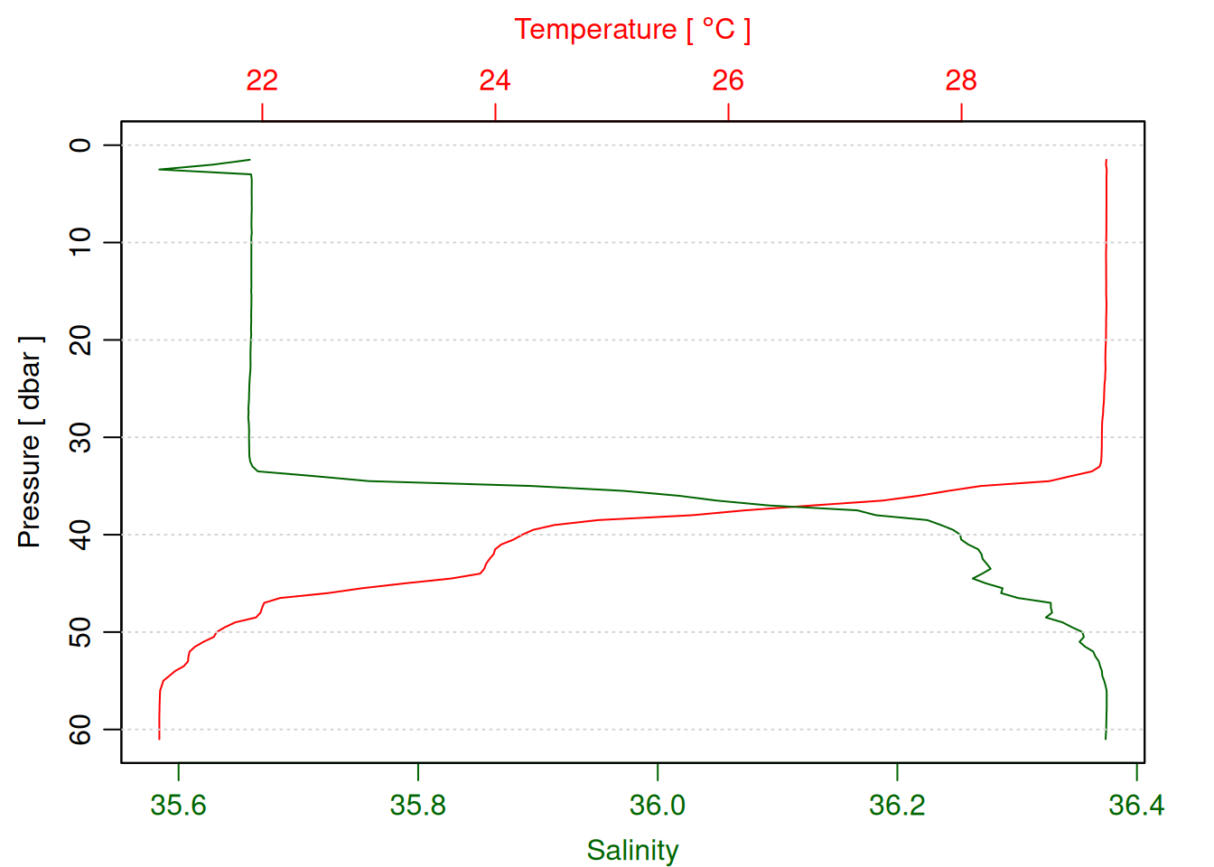 tryCatch({ oce::plotProfile(decimated_cast)# TODO: plot chl & do (prereq handle other_params in ctd_load_from_csv call above)}, error =function(e) {print("decimated cast not found")})