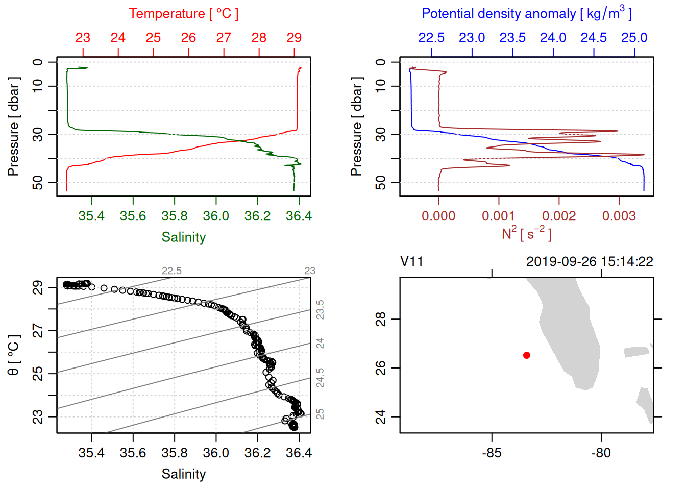 tryCatch({ trimmed_cast <-ctdTrim(cast) decimated_cast <-ctdDecimate(trimmed_cast, p =0.1)# plotting can cause the xlim failureplot(decimated_cast)# === export ===# Get the scan numbers that remain after cleaning cleaned_scans <- decimated_cast@data$scan# Load original raw data to keep all columns ctd_raw <- readr::read_csv(dataFile, show_col_types =FALSE)# Filter raw data to only include the cleaned scans cast_df <- ctd_raw %>%filter(!is.na(sea_water_pressure)) %>%# Remove rows without pressure datamutate(row_num =row_number()) %>%filter(row_num %in% cleaned_scans) %>%select(-row_num)# Add metadata cast_df <-mutate( cast_df,station = station_id,cruise_id = cruise_id )# Check if there are any rows in the cleaned dataif (nrow(cast_df) ==0) {cat("\n=== WARNING: NO DATA AFTER CLEANING ===\n")cat("Cast ID:", params$cast_id, "\n")cat("Station:", station_id, "\n")cat("Cruise:", cruise_id, "\n\n")cat("Raw data rows (with pressure):", sum(!is.na(ctd_raw$sea_water_pressure)), "\n")cat("Cleaned scans to keep:", length(cleaned_scans), "\n")cat("Resulting rows:", nrow(cast_df), "\n\n")cat("Raw data summary:\n")print(summary(ctd_raw[c("sea_water_pressure", "sea_water_temperature", "sea_water_salinity")]))cat("\nCleaned scans (first 20):\n")print(head(cleaned_scans, 20))cat("\n=== CSV FILE NOT CREATED (no data) ===\n\n") } else {# create folder if doesn't exist clean_data_loc <- here::here("data/02_clean")try(fs::dir_create(clean_data_loc))# save ctd to .csv (without row names/indices)write.csv(cast_df, glue("{clean_data_loc}/{params$cast_id}.csv"), row.names =FALSE)cat("Successfully saved", nrow(cast_df), "rows to", glue("{params$cast_id}.csv"), "\n") }}, error =function(e) {cat("\n=== CTD PROCESSING ERROR ===\n")cat("Cast ID:", params$cast_id, "\n")cat("Error message:\n", conditionMessage(e), "\n\n")# Safely inspect objects that might or might not exist when the error happenedif (exists("decimated_cast")) { df <-try(as.data.frame(decimated_cast@data), silent =TRUE)if (!inherits(df, "try-error")) {cat("Dataframe columns:\n")print(names(df))cat("\nSummary of key columns (scan, pressure, temperature, salinity if present):\n") known_cols <-intersect(c("scan", "pressure", "temp", "temperature", "salinity", "conductivity"), names(df))print(summary(df[known_cols], digits =3))cat("\nHead of dataframe:\n")print(head(df)) } else {cat("Could not extract dataframe from decimated_cast.\n") } } else {cat("decimated_cast was never created before the error.\n") }cat("\n=== END ERROR DEBUG INFO ===\n\n")})
