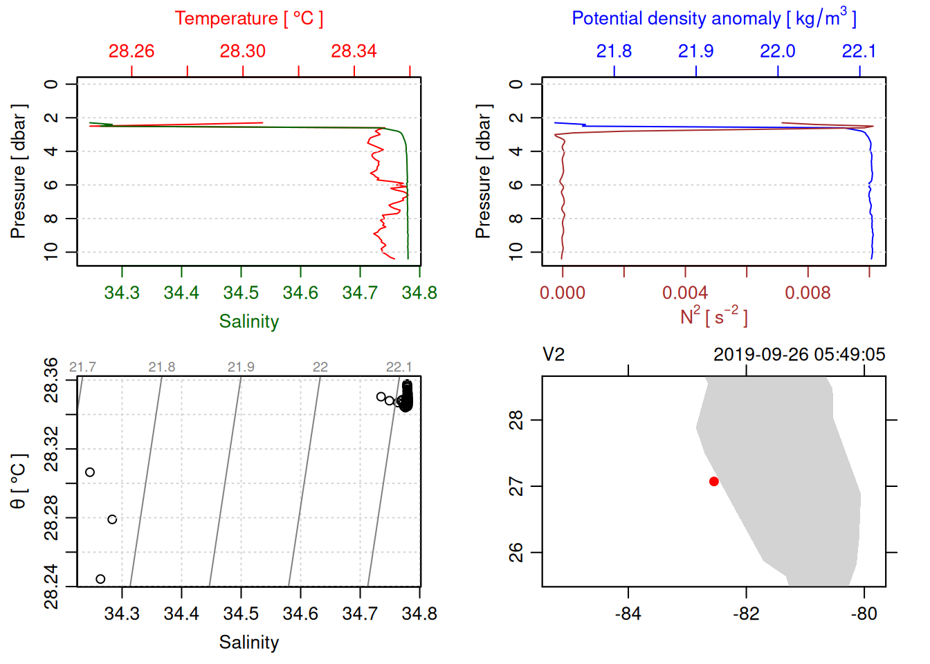 tryCatch({ trimmed_cast <-ctdTrim(cast) decimated_cast <-ctdDecimate(trimmed_cast, p =0.1)# plotting can cause the xlim failureplot(decimated_cast)# === export ===# Get the scan numbers that remain after cleaning cleaned_scans <- decimated_cast@data$scan# Load original raw data to keep all columns ctd_raw <- readr::read_csv(dataFile, show_col_types =FALSE)# Filter raw data to only include the cleaned scans cast_df <- ctd_raw %>%filter(!is.na(sea_water_pressure)) %>%# Remove rows without pressure datamutate(row_num =row_number()) %>%filter(row_num %in% cleaned_scans) %>%select(-row_num)# Add metadata cast_df <-mutate( cast_df,station = station_id,cruise_id = cruise_id )# Check if there are any rows in the cleaned dataif (nrow(cast_df) ==0) {cat("\n=== WARNING: NO DATA AFTER CLEANING ===\n")cat("Cast ID:", params$cast_id, "\n")cat("Station:", station_id, "\n")cat("Cruise:", cruise_id, "\n\n")cat("Raw data rows (with pressure):", sum(!is.na(ctd_raw$sea_water_pressure)), "\n")cat("Cleaned scans to keep:", length(cleaned_scans), "\n")cat("Resulting rows:", nrow(cast_df), "\n\n")cat("Raw data summary:\n")print(summary(ctd_raw[c("sea_water_pressure", "sea_water_temperature", "sea_water_salinity")]))cat("\nCleaned scans (first 20):\n")print(head(cleaned_scans, 20))cat("\n=== CSV FILE NOT CREATED (no data) ===\n\n") } else {# create folder if doesn't exist clean_data_loc <- here::here("data/02_clean")try(fs::dir_create(clean_data_loc))# save ctd to .csv (without row names/indices)write.csv(cast_df, glue("{clean_data_loc}/{params$cast_id}.csv"), row.names =FALSE)cat("Successfully saved", nrow(cast_df), "rows to", glue("{params$cast_id}.csv"), "\n") }}, error =function(e) {cat("\n=== CTD PROCESSING ERROR ===\n")cat("Cast ID:", params$cast_id, "\n")cat("Error message:\n", conditionMessage(e), "\n\n")# Safely inspect objects that might or might not exist when the error happenedif (exists("decimated_cast")) { df <-try(as.data.frame(decimated_cast@data), silent =TRUE)if (!inherits(df, "try-error")) {cat("Dataframe columns:\n")print(names(df))cat("\nSummary of key columns (scan, pressure, temperature, salinity if present):\n") known_cols <-intersect(c("scan", "pressure", "temp", "temperature", "salinity", "conductivity"), names(df))print(summary(df[known_cols], digits =3))cat("\nHead of dataframe:\n")print(head(df)) } else {cat("Could not extract dataframe from decimated_cast.\n") } } else {cat("decimated_cast was never created before the error.\n") }cat("\n=== END ERROR DEBUG INFO ===\n\n")})