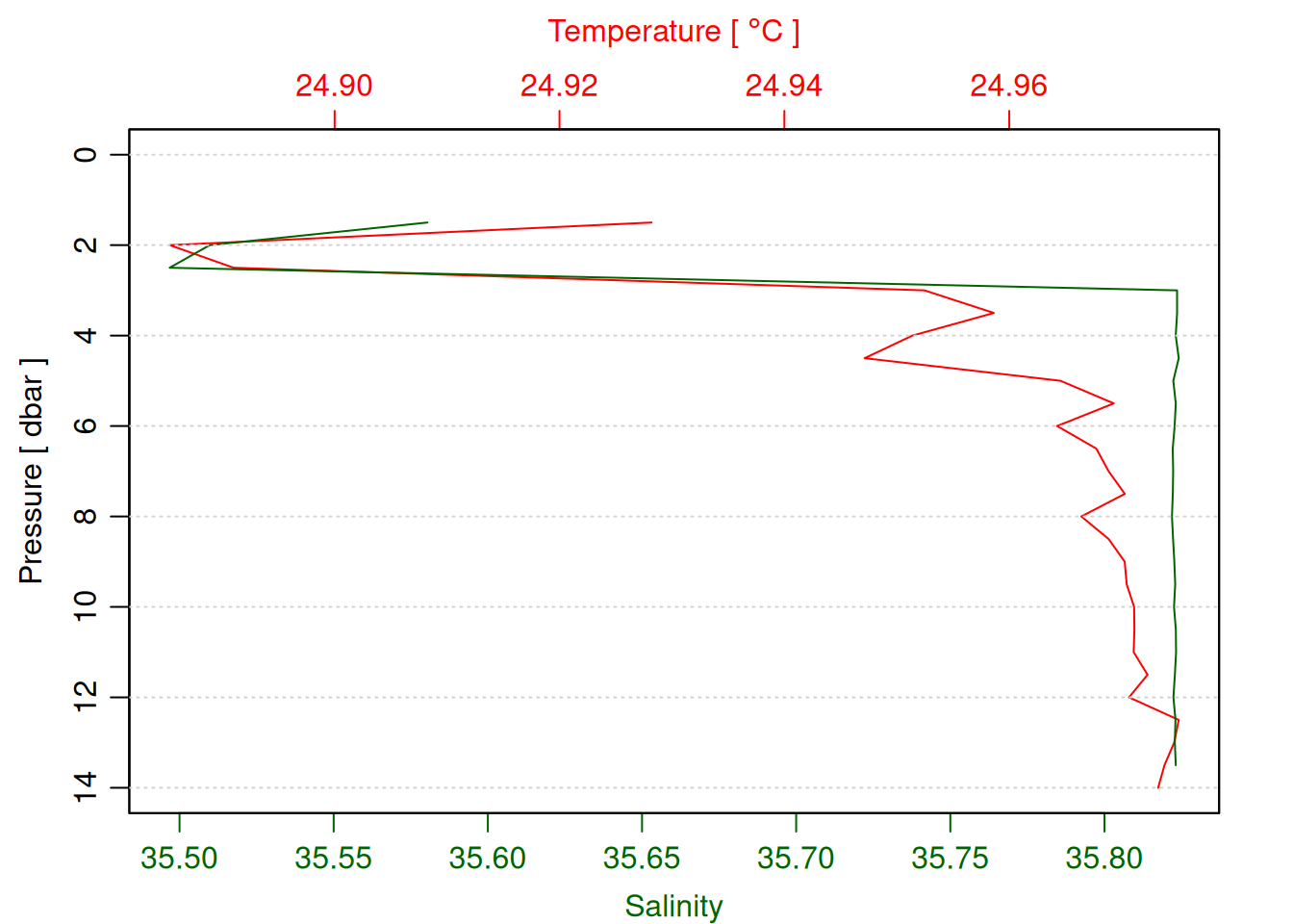 tryCatch({ oce::plotProfile(decimated_cast)# TODO: plot chl & do (prereq handle other_params in ctd_load_from_csv call above)}, error =function(e) {print("decimated cast not found")})
