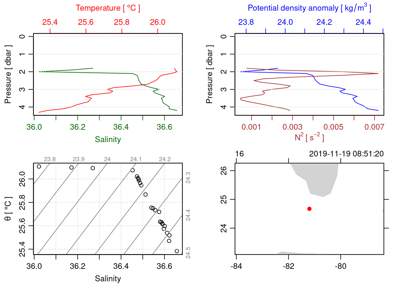 tryCatch({ trimmed_cast <-ctdTrim(cast) decimated_cast <-ctdDecimate(trimmed_cast, p =0.1)# plotting can cause the xlim failureplot(decimated_cast)# === export ===# Get the scan numbers that remain after cleaning cleaned_scans <- decimated_cast@data$scan# Load original raw data to keep all columns ctd_raw <- readr::read_csv(dataFile, show_col_types =FALSE)# Filter raw data to only include the cleaned scans cast_df <- ctd_raw %>%filter(!is.na(sea_water_pressure)) %>%# Remove rows without pressure datamutate(row_num =row_number()) %>%filter(row_num %in% cleaned_scans) %>%select(-row_num)# Add metadata cast_df <-mutate( cast_df,station = station_id,cruise_id = cruise_id )# Check if there are any rows in the cleaned dataif (nrow(cast_df) ==0) {cat("\n=== WARNING: NO DATA AFTER CLEANING ===\n")cat("Cast ID:", params$cast_id, "\n")cat("Station:", station_id, "\n")cat("Cruise:", cruise_id, "\n\n")cat("Raw data rows (with pressure):", sum(!is.na(ctd_raw$sea_water_pressure)), "\n")cat("Cleaned scans to keep:", length(cleaned_scans), "\n")cat("Resulting rows:", nrow(cast_df), "\n\n")cat("Raw data summary:\n")print(summary(ctd_raw[c("sea_water_pressure", "sea_water_temperature", "sea_water_salinity")]))cat("\nCleaned scans (first 20):\n")print(head(cleaned_scans, 20))cat("\n=== CSV FILE NOT CREATED (no data) ===\n\n") } else {# create folder if doesn't exist clean_data_loc <- here::here("data/02_clean")try(fs::dir_create(clean_data_loc))# save ctd to .csv (without row names/indices)write.csv(cast_df, glue("{clean_data_loc}/{params$cast_id}.csv"), row.names =FALSE)cat("Successfully saved", nrow(cast_df), "rows to", glue("{params$cast_id}.csv"), "\n") }}, error =function(e) {cat("\n=== CTD PROCESSING ERROR ===\n")cat("Cast ID:", params$cast_id, "\n")cat("Error message:\n", conditionMessage(e), "\n\n")# Safely inspect objects that might or might not exist when the error happenedif (exists("decimated_cast")) { df <-try(as.data.frame(decimated_cast@data), silent =TRUE)if (!inherits(df, "try-error")) {cat("Dataframe columns:\n")print(names(df))cat("\nSummary of key columns (scan, pressure, temperature, salinity if present):\n") known_cols <-intersect(c("scan", "pressure", "temp", "temperature", "salinity", "conductivity"), names(df))print(summary(df[known_cols], digits =3))cat("\nHead of dataframe:\n")print(head(df)) } else {cat("Could not extract dataframe from decimated_cast.\n") } } else {cat("decimated_cast was never created before the error.\n") }cat("\n=== END ERROR DEBUG INFO ===\n\n")})