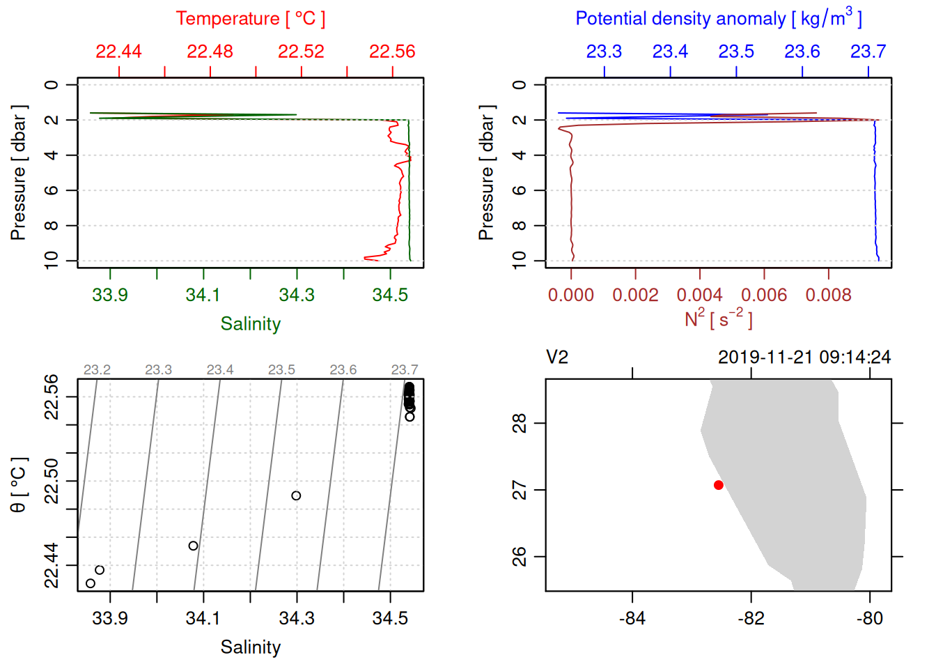 tryCatch({ trimmed_cast <-ctdTrim(cast) decimated_cast <-ctdDecimate(trimmed_cast, p =0.1)# plotting can cause the xlim failureplot(decimated_cast)# === export ===# Get the scan numbers that remain after cleaning cleaned_scans <- decimated_cast@data$scan# Load original raw data to keep all columns ctd_raw <- readr::read_csv(dataFile, show_col_types =FALSE)# Filter raw data to only include the cleaned scans cast_df <- ctd_raw %>%filter(!is.na(sea_water_pressure)) %>%# Remove rows without pressure datamutate(row_num =row_number()) %>%filter(row_num %in% cleaned_scans) %>%select(-row_num)# Add metadata cast_df <-mutate( cast_df,station = station_id,cruise_id = cruise_id )# Check if there are any rows in the cleaned dataif (nrow(cast_df) ==0) {cat("\n=== WARNING: NO DATA AFTER CLEANING ===\n")cat("Cast ID:", params$cast_id, "\n")cat("Station:", station_id, "\n")cat("Cruise:", cruise_id, "\n\n")cat("Raw data rows (with pressure):", sum(!is.na(ctd_raw$sea_water_pressure)), "\n")cat("Cleaned scans to keep:", length(cleaned_scans), "\n")cat("Resulting rows:", nrow(cast_df), "\n\n")cat("Raw data summary:\n")print(summary(ctd_raw[c("sea_water_pressure", "sea_water_temperature", "sea_water_salinity")]))cat("\nCleaned scans (first 20):\n")print(head(cleaned_scans, 20))cat("\n=== CSV FILE NOT CREATED (no data) ===\n\n") } else {# create folder if doesn't exist clean_data_loc <- here::here("data/02_clean")try(fs::dir_create(clean_data_loc))# save ctd to .csv (without row names/indices)write.csv(cast_df, glue("{clean_data_loc}/{params$cast_id}.csv"), row.names =FALSE)cat("Successfully saved", nrow(cast_df), "rows to", glue("{params$cast_id}.csv"), "\n") }}, error =function(e) {cat("\n=== CTD PROCESSING ERROR ===\n")cat("Cast ID:", params$cast_id, "\n")cat("Error message:\n", conditionMessage(e), "\n\n")# Safely inspect objects that might or might not exist when the error happenedif (exists("decimated_cast")) { df <-try(as.data.frame(decimated_cast@data), silent =TRUE)if (!inherits(df, "try-error")) {cat("Dataframe columns:\n")print(names(df))cat("\nSummary of key columns (scan, pressure, temperature, salinity if present):\n") known_cols <-intersect(c("scan", "pressure", "temp", "temperature", "salinity", "conductivity"), names(df))print(summary(df[known_cols], digits =3))cat("\nHead of dataframe:\n")print(head(df)) } else {cat("Could not extract dataframe from decimated_cast.\n") } } else {cat("decimated_cast was never created before the error.\n") }cat("\n=== END ERROR DEBUG INFO ===\n\n")})