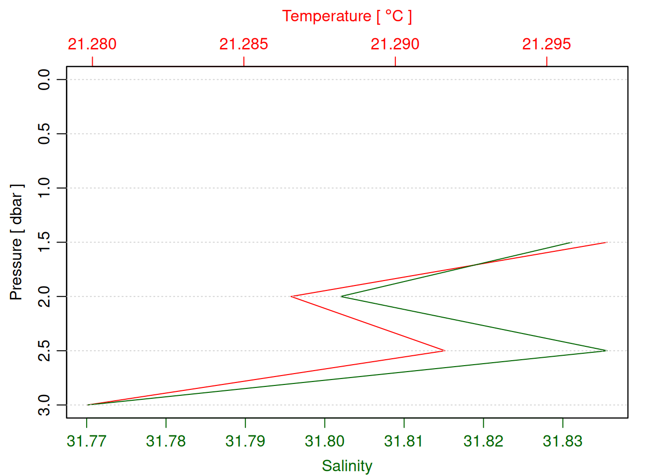 tryCatch({ oce::plotProfile(decimated_cast)# TODO: plot chl & do (prereq handle other_params in ctd_load_from_csv call above)}, error =function(e) {print("decimated cast not found")})