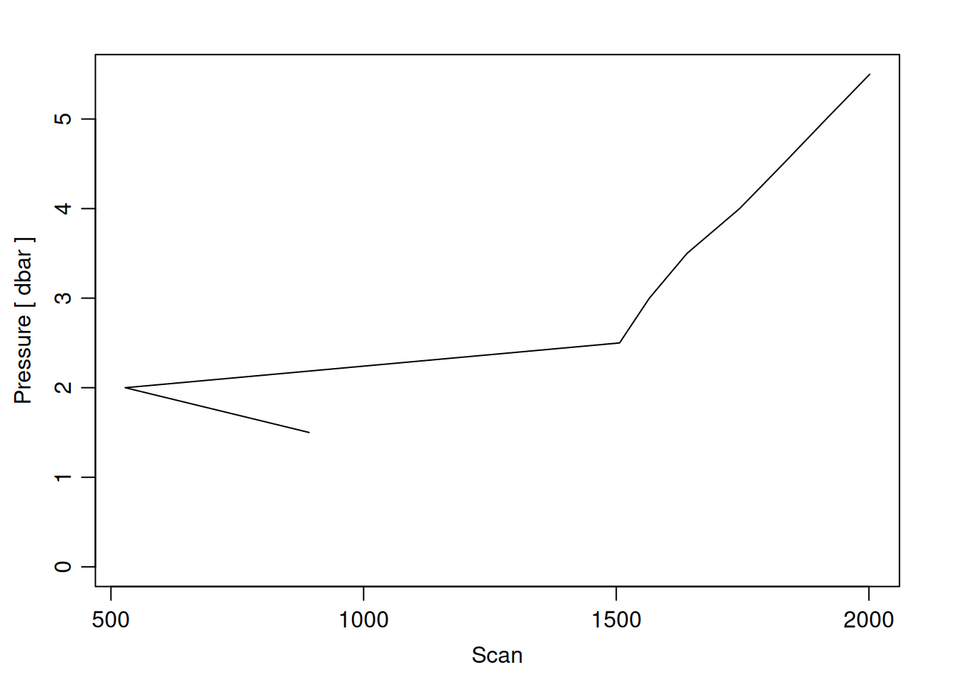 tryCatch({ trimmed_cast <-ctdTrim(cast) decimated_cast <-ctdDecimate(trimmed_cast, p =0.5)# plotting can cause the xlim failureplotScan(decimated_cast)# === export === cast_df <-as.data.frame(decimated_cast@data)# Add metadata cast_df <-mutate( cast_df,station = station_id,cruise_id = cruise_id )# drop NA rows left by cleaning cast_df <-subset(cast_df, !is.na(scan))# create folder if doesn't exist clean_data_loc <- here::here("data/02_clean")try(fs::dir_create(clean_data_loc))# save ctd to .csvwrite.csv(cast_df, glue("{clean_data_loc}/{params$cast_id}.csv"))}, error =function(e) {cat("\n=== CTD PROCESSING ERROR ===\n")cat("Cast ID:", params$cast_id, "\n")cat("Error message:\n", conditionMessage(e), "\n\n")# Safely inspect objects that might or might not exist when the error happenedif (exists("decimated_cast")) { df <-try(as.data.frame(decimated_cast@data), silent =TRUE)if (!inherits(df, "try-error")) {cat("Dataframe columns:\n")print(names(df))cat("\nSummary of key columns (scan, pressure, temperature, salinity if present):\n") known_cols <-intersect(c("scan", "pressure", "temp", "temperature", "salinity", "conductivity"), names(df))print(summary(df[known_cols], digits =3))cat("\nHead of dataframe:\n")print(head(df)) } else {cat("Could not extract dataframe from decimated_cast.\n") } } else {cat("decimated_cast was never created before the error.\n") }cat("\n=== END ERROR DEBUG INFO ===\n\n")})